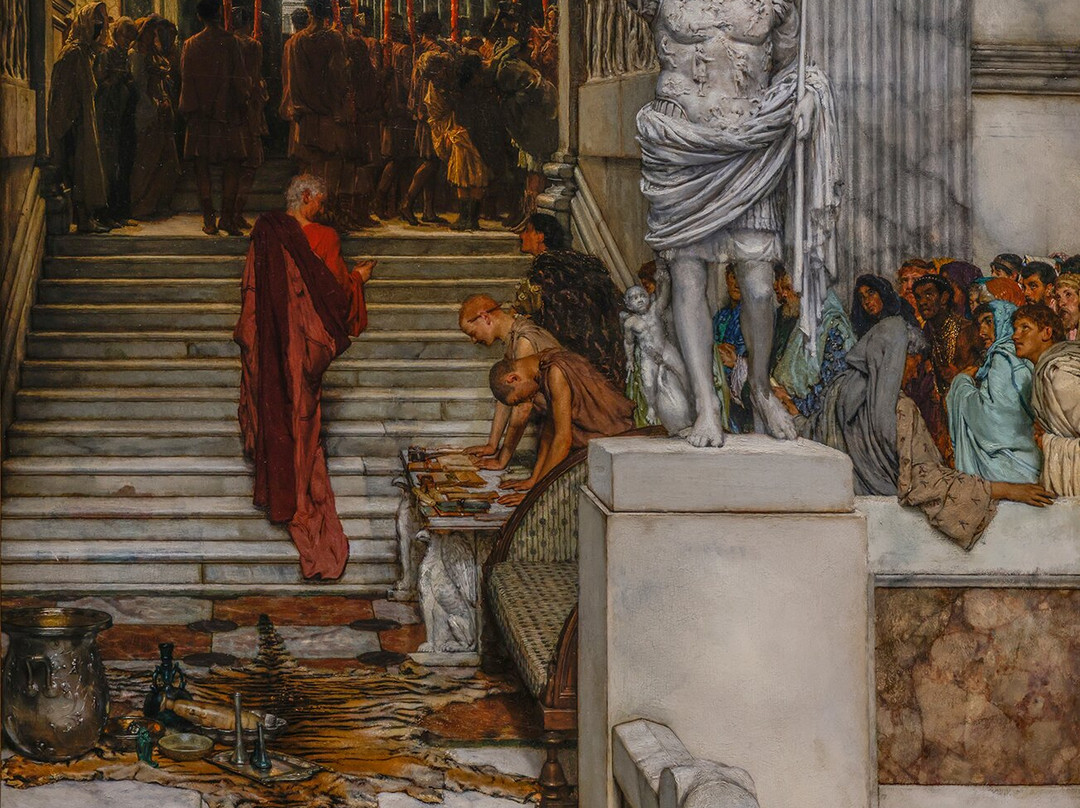 点评:Old St. Paul’s had stood for almost six centuries when, in 1666, it was destroyed in the Great Fire. Charged with rebuilding, Christopher Wren created the tallest church in London, taller than the towers of Westminster Abbey—indeed, taller than any in England, save one (and its dome second only to that of St. Peter’s in Rome). In the crypt are entombed Britain’s greatest heroes: Lord Nelson, who defeated Napoleon at the Battle of the Nile and Trafalgar, and the Duke of Wellington, who was victorious at the decisive Battle of Waterloo. Here, too, Christopher Wren is buried, the architect of the cathedral, whose epitaph was written by his son: “Reader, if you seek his memorial—look around you.” Lesser lights include the poet John Donne, former dean of the cathedral (whose monument was the only one to survive the fire); and, dimmer still, Lawrence Alma-Tadema, famous for his depictions of Ancient Rome (and a personal favorite). "After the Meeting," in fact, was acquired by the National Gallery this August, only a few months ago.