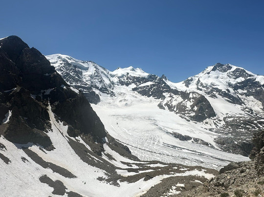 Von der Talstation geht es mit der 🚡 in ca. 7 Minuten auf dem Gipfel. Dort oben angekommen hat man einen tollen Blick auf die umliegenden Berge, u.a. den Piz Bernina und den Piz Palü.