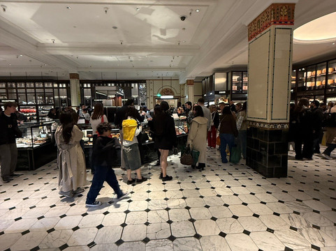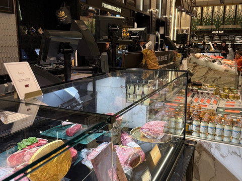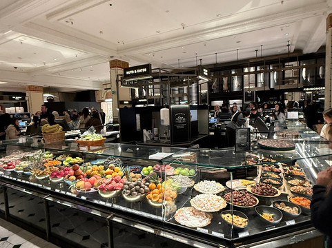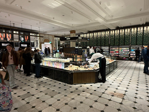 而哈罗德百货真正令人惊艳之处——即使不购物也值得一游——在于其著名的美食广场。这里汇聚了琳琅满目的美食摊位:新鲜海鲜、现点现做的寿司、顶级肉类、来自世界各地的奶酪,以及数不胜数的甜点。
