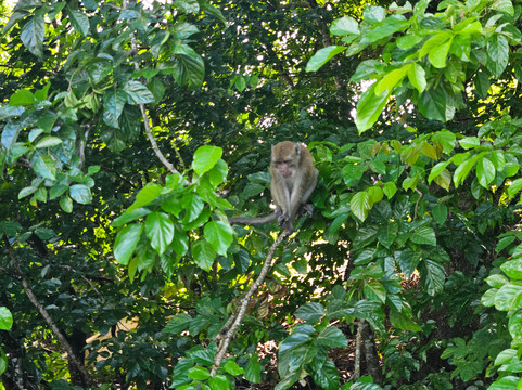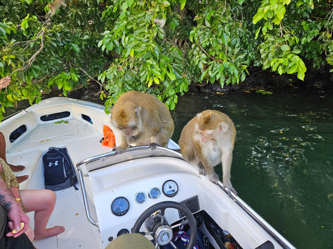 它们会爬到船上,看看自己想吃什么,然后又回到树上消化它们的食物。小香蕉和苹果似乎是它们的最爱,能吸引它们的兴趣。