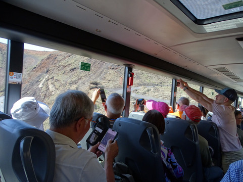 ……挤进一辆巴士,参加一个强制性的35分钟游览,导游用英语和西班牙语讲解……车窗外(谁也不许下车)其他46名乘客对着每一个小火山口惊叹不已(呃,今天早上我们走进了一个比它大两倍的火山口!)……