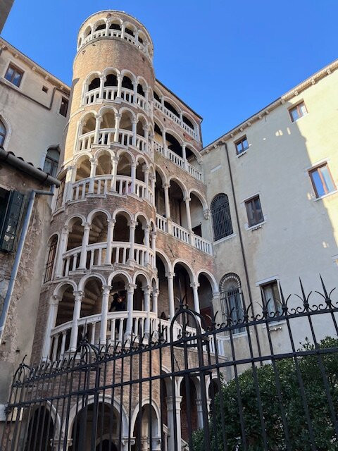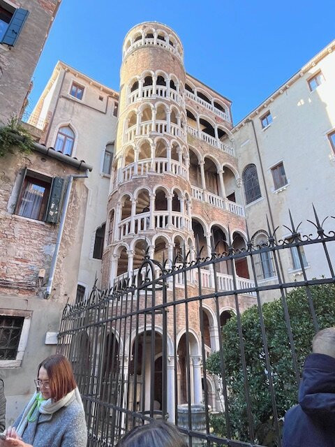 The unique design of the spiral staircase stands out among the traditional Venetian buildings, and the intricate details are beautiful and eye-catching.