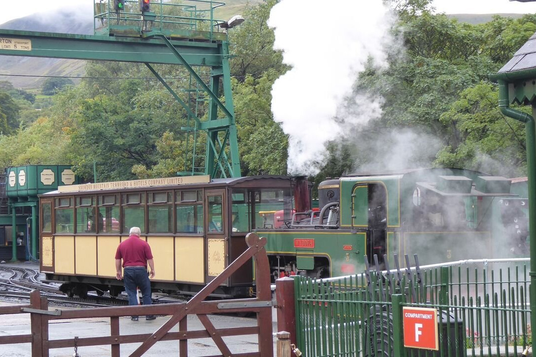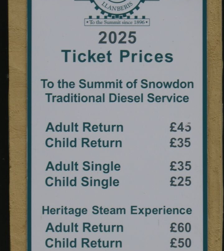 翻译:在斯诺登尼亚国家公园逗留期间,我们还乘坐了斯诺登山铁路登上了斯诺登山(威尔士语:Yr Wyddfa)。由于车票通常售罄,我们提前很久就预订了。我们原本选择的是蒸汽火车,成人票价为60英镑,儿童票价为50英镑。然而,就在我们预定行程的前几天,我们被告知蒸汽机车停运,需要改乘柴油机车。柴油机车的票价为成人45英镑,儿童35英镑。