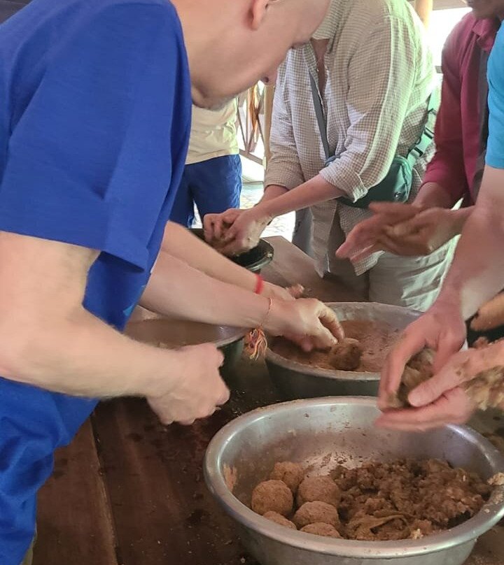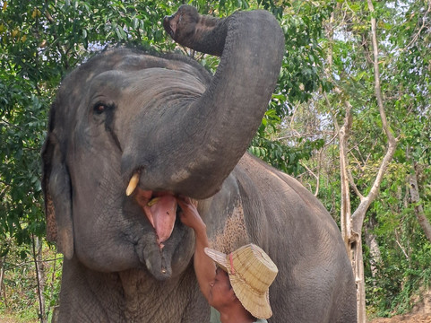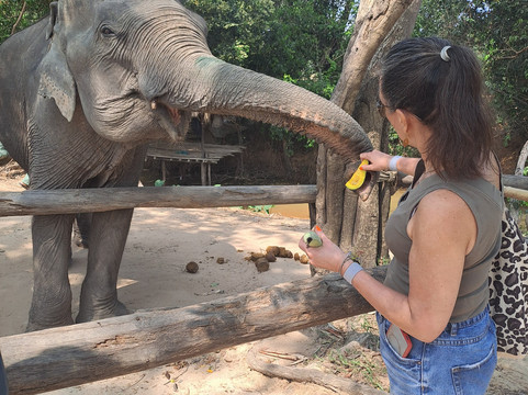 翻译:我加入了一个由十位游客组成的小团队,体验了一次温馨愉快的与大象互动之旅。首先,我们听取了关于大象的介绍,包括它们的来历、来源以及需要遵守的程序和规则。我们准备了它们的午餐,除了香蕉、南瓜、竹子和竹叶之外,我们还用米饭、稻壳粉和一些水做了一些类似肉丸的食物,然后喂给了大象!它们一如既往地非常饿,没过多久就把食物全部吃光了!这是一次非常愉快的体验,而接下来的环节更加精彩——洗澡时间!大量的水,大量的泼水,以及嬉戏玩耍,之后又喂了一些美味的食物。