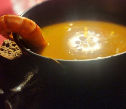 我们和其他六位客人一起参加了 POETs Progressive 晚宴。日落时分,在葡萄园里享用开胃小菜和搭配葡萄酒,令人叹为观止。前菜在葡萄园边缘享用,配以美味的马赛鱼汤,然后是精致的主菜——在壁炉旁供应,甜点则在酒桶房享用。整晚,我们欢声笑语,与其他客人分享故事。我提出了一些限制饮食的要求,但主厨 Tomer 完全没有问题。
