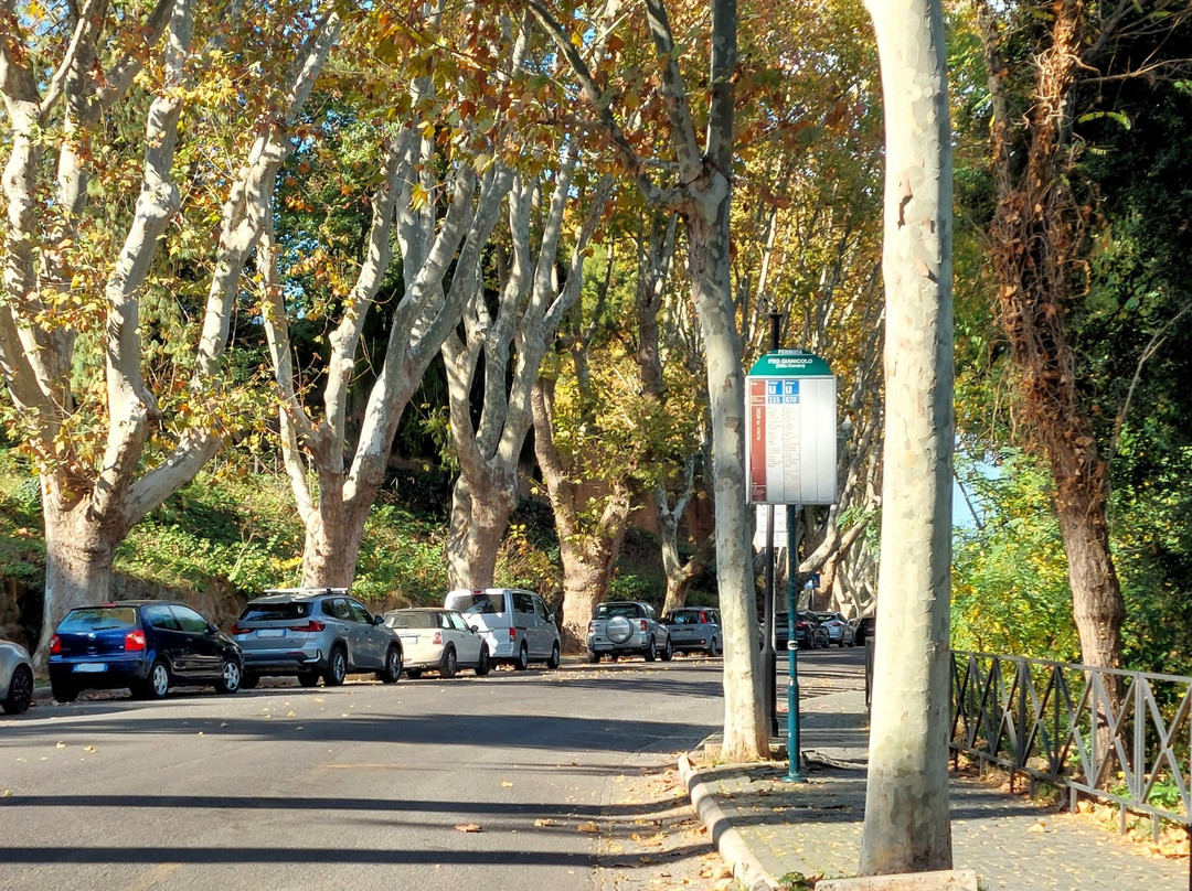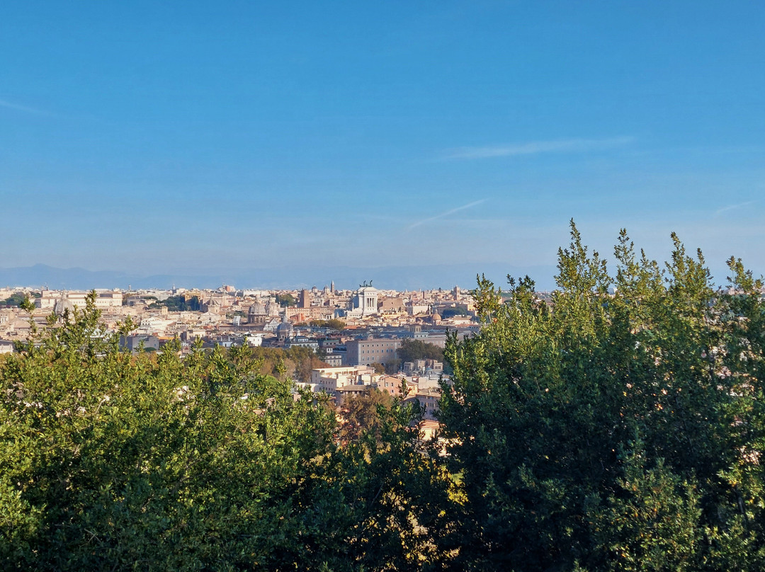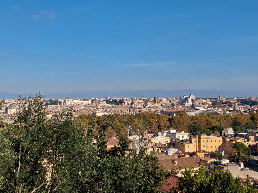 点评:Così viene anche impropriamente definita quest'altura, tra il Vaticano, Monteverde e il sottostante rione di Trastevere. Colle sacro a Giano (da cui è derivato Gianicolo), fin dall'antichità ha avuto funzione difensiva (da ultimo ricordiamo che qui si svolse la fase più cruenta della difesa della Repubblica Romana nel 1849) ma oggi è un colle ameno, caratterizzato soprattutto da molto verde, quasi un unico grande parco. Famoso soprattutto per le viste panoramiche sulla città, grazie alla sua posizione ai margini occidentali del centro storico, che si possono avere un po' da per tutto e non solo dalla Terrazza del Gianicolo, in piazzale Garibaldi (viste che si apprezzano di più, per un fattore luce, nel tardo pomeriggio e nel tramonto); ma non mancano altri motivi d'interesse, a cominciare da una delle fontane tra le più belle di Roma, la Fontana dell'Acqua Paola (Er Fontanone), e poi la chiesa di San Pietro in Montorio e accanto la Real Accademia di Spagna con il Tempietto del Bramante, dove la tradizione afferma sia stato crocifisso San Pietro, il Faro del Gianicolo, la presunta facciata della Casa di Michelangelo, e quindi tutte le attrazioni legate al Risorgimento in genere e ai Garibaldini in particolare, che proprio qui abbondano proprio per i citati fatti del 1849: Il museo della Repubblica Romana e della Memoria Garibaldina, all'interno della Porta di San Pancrazio, il mausoleo-Ossario Garibaldino, il grandioso monumento a Garibaldi e, poco lontano, quello suggestivo dedicato ad Anita, il monumento a memoria di Ciceruacchio, il muro con incisi gli articoli della Costituzione della Repubblica Romana, i tantissimi busti sparsi lungo la passeggiata del Gianicolo dedicati a garibaldini e patrioti che hanno combattuto per la Difesa di Roma e per il Risorgimento in genere (se ne contano oltre 80). E magari si può citare anche il giornaliero sparo del cannone delle ore 12, che avviene proprio nei pressi di piazzale Garibaldi.