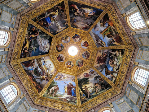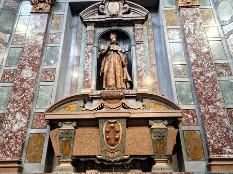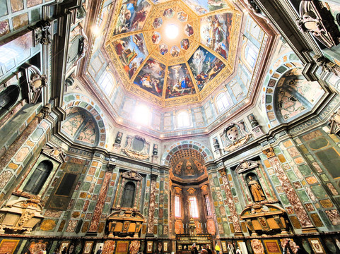 另一座小教堂——王子小教堂(Cappelle dei Principi),气势更为宏伟。这座八角形的小教堂拥有59米高的穹顶,内有六具巨大的大理石棺,四周环绕着大理石雕琢的墙壁、地板,以及各种色彩的装饰。