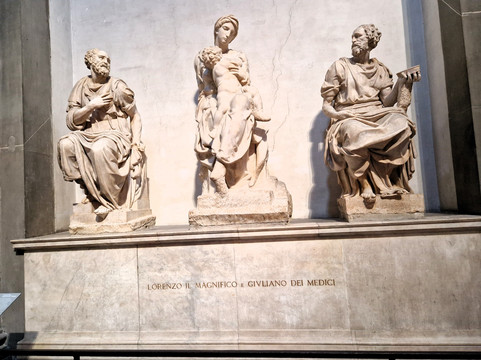 新圣器室(Sagrestia Nuova)内有洛伦佐·马格尼菲科的陵墓,周围环绕着描绘昼夜、昼夜、黄昏和黎明的雕像。圣器室和墓穴均由米开朗基罗设计和建造,他那充满阳刚之气的雕像与西斯廷教堂壁画中他创作的男性肖像画相得益彰。
