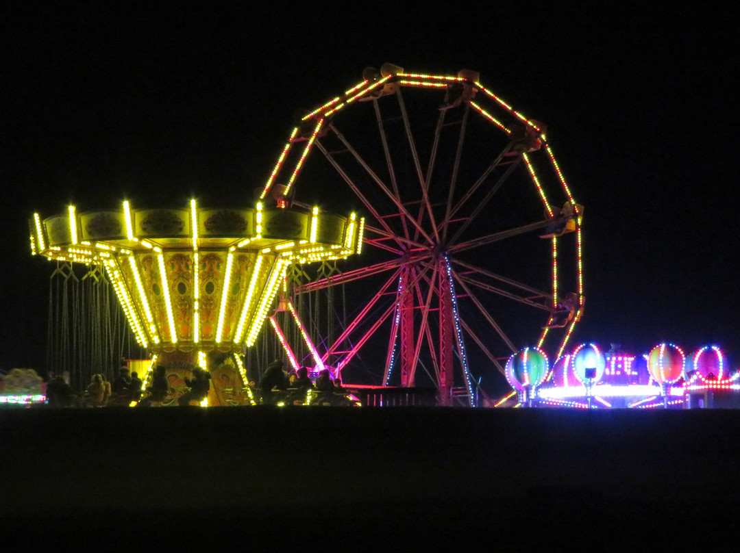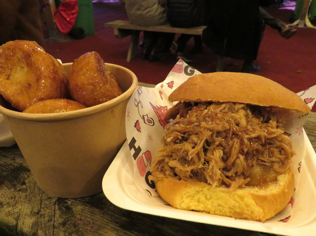 节日游乐设施/美食区当然在晚上也开放,虽然人很多,但并不拥挤,而且价格虽然贵,但与其他同类活动相比也算合理,所以感觉还算公道。更令人惊喜的是,这里不仅有一种,而是有多种无麸质食品可供选择,至少有三个不同的食品摊位提供无麸质食品,这让我妻子有了很好的选择,而不是像往常那样只有“这一种”甚至更糟糕的选择。作为参考,一杯酥皮点心配蛋奶沙司售价 9 英镑,烤乳猪面包配一杯烤土豆售价 13.50 英镑。