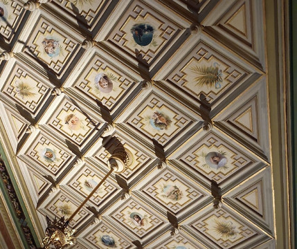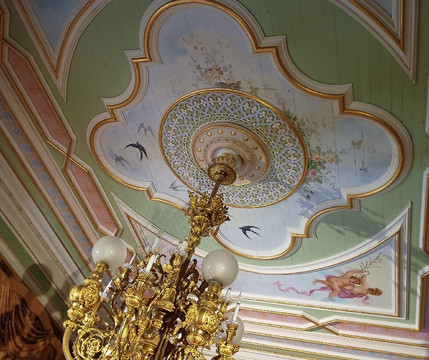 Em um dos salões,as pinturas no teto são referências as viagens feitas pela família
