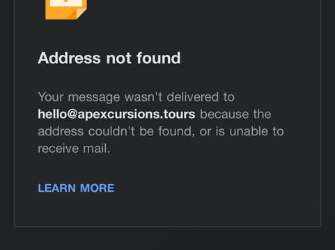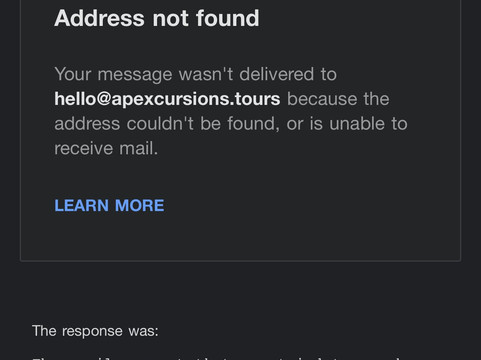 翻译:我在 TripAdvisor 上找到 Apexcursions(最佳旅游、漂流、酒庄及更多)后,预订了他们的行程。我付款并收到了收据,但却一直没有收到承诺的接送信息。我尝试拨打电话时,电话一直处于停机状态。我给他们发了邮件,结果邮件被退回,提示“找不到邮件”——即使我用其他账户尝试也一样。