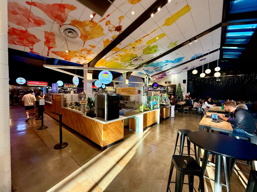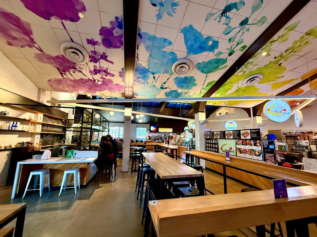 美食广场经常有现场娱乐表演和艺术展览,而且还有包间可以预订举办私人活动。所有工作人员都非常友好热情。我很喜欢里面的装饰——充满活力,热闹非凡,既有很多公共座位,也有一些比较私密的座位——还有几个露台区域可以供户外用餐,而且欢迎狗狗入内。