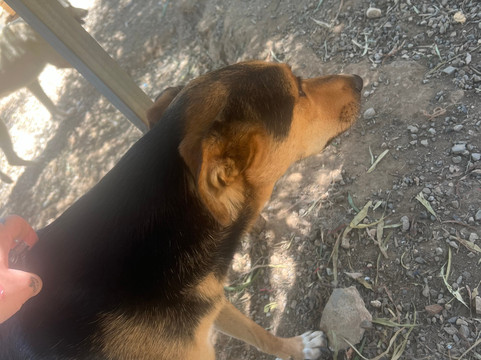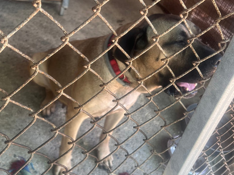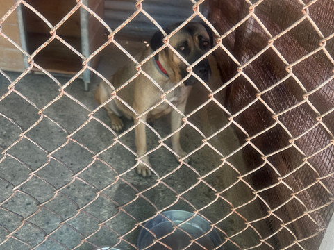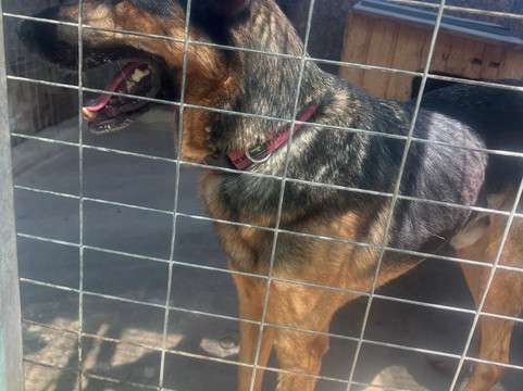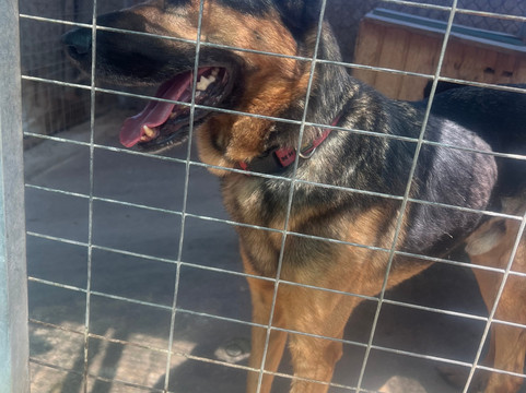 首先,我们被带到了“花园”,那里主要是小狗,让它们进行社交,那里有充足的食物、水和庇护所,这些小狗可以自由漫步,你可以得到它们所有的爱。这里是漂亮的 3 岁小狗 Mazel 的住所,他非常友好,到处跟着你,很难离开他。