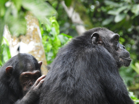 最后,黑猩猩也很棒……比大猩猩的徒步要轻松得多。听着丛林中黑猩猩群的相互呼唤,就像我小时候看过的每一部泰山电影的配乐一样。我们遇到了一家三口,其中有一只非常小的黑猩猩。两只成年黑猩猩一直在互相梳理毛发,而其他小黑猩猩则在周围嬉戏。