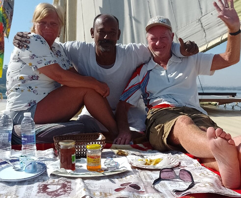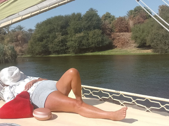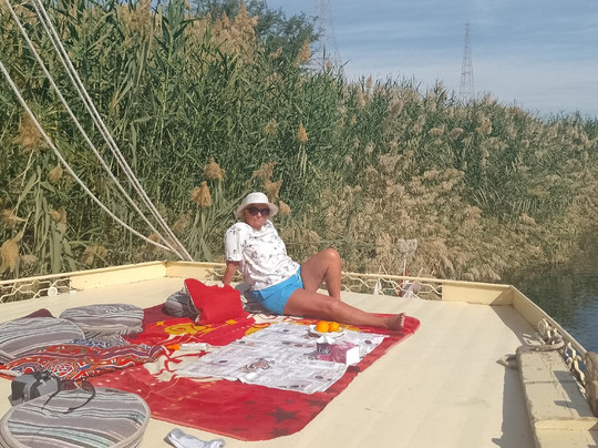 翻译:我们坐在上层甲板上,温暖的阳光下,我们一边享用美食,一边静静地看着尼罗河岸边的生活。我们船的船长是出色的萨拉赫先生,他能判断风吹动船只的风向。