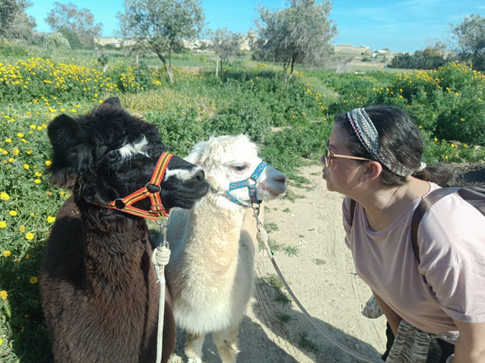在附近的乡间小路上悠闲地漫步,与可爱的羊驼白雪公主和贝儿以及它们可爱友好的饲养员米查在一起后,我们回到了农场,在那里我们亲手喂养了所有 6 只羊驼,包括 2 只幼年羊驼,并花了一些时间去了解它们。你还可以在这个位于戈佐岛 Xewkija 的独特宠物农场与众多鸟类、兔子和山羊见面和互动。