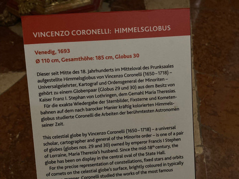 对我来说,其中一个亮点是文森佐·科罗内利(Vincenzo Coronelli)的天球仪。上面的阿拉伯文铭文令我着迷,但令我惊讶的是,配套的说明中竟然没有提到这个细节。如果能提供更多关于这些独特之处的背景信息,以及馆内藏书的信息,将极大地丰富游客的体验。