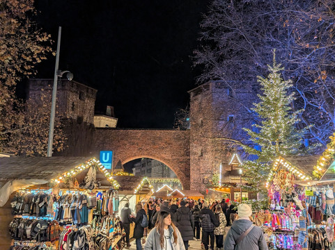 翻译:森德林格门(Sendlinger Tor)是慕尼黑的一座城门,建于1285年至1337年间。我们此行的目的纯粹是为了参观圣诞节期间环绕城门的圣诞市场。白天这里景色宜人,但到了晚上,就像慕尼黑其他圣诞市场一样,会变得非常拥挤。我们在这里找到了一些美味的烤香肠,附近也有一些不错的纪念品商店,但最吸引人的无疑是圣诞市场的摊位和灯光。