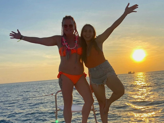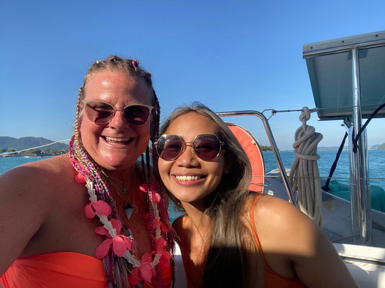 翻译:我强烈推荐这家旅行社,从你抵达的那一刻起,他们就像家人一样热情款待你。他们有三艘双体船可供选择,船员热情友好,乐于助人。我们乘坐的是他们38英尺的船。我们巡航经过了普罗姆帖海角和尤奈海滩,天气晴朗,景色宜人。船上的小吃和食物都非常棒。他们烤了牛排、蔬菜和菠萝,还有蔬菜春卷。韩国葡萄是我见过最大的。Jhenna和她快两岁的女儿Kylie让每个人都玩得不亦乐乎。Kylie非常可爱,喜欢在游艇上玩耍和唱歌。我们度过了完美的一天,欣赏了海上壮丽的日落。日落后,月亮仿佛在对我们微笑。我们玩得非常开心。下次去普吉岛,我一定会再次选择他们。你绝对不会失望。他们更大的游艇上设有卧室,可以过夜或进行更长时间的旅行。