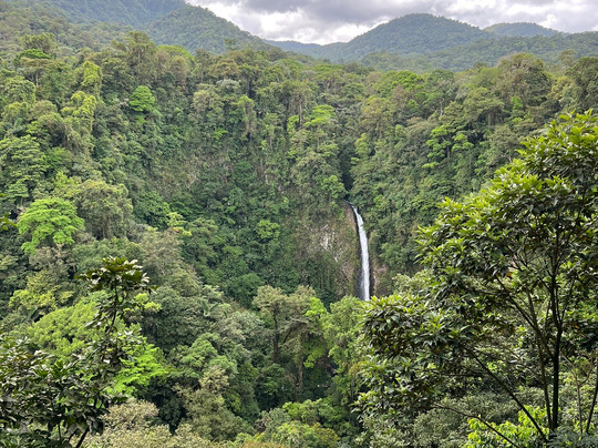 点评:A beautiful waterfall surrounded by lush green tropical forest.