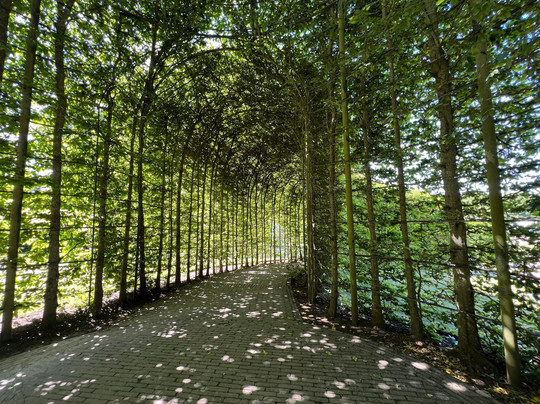 我们坐在那里,一边喝着咖啡,一边欣赏喷泉,欣赏着两边巨大的树篱,仔细一看,树篱就像一条蜿蜒的绿色通道!