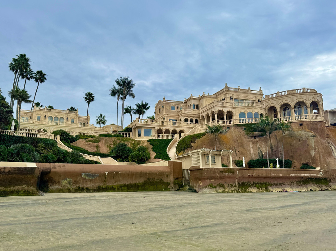 海滩的一端是海洋餐厅(Marine Room)和拉霍亚海滩网球俱乐部(La Jolla Beach and Tennis Club),悬崖边上还建着一些豪宅。附近旅游租赁店的皮划艇爱好者们正在接受安全讲解,然后下水。
