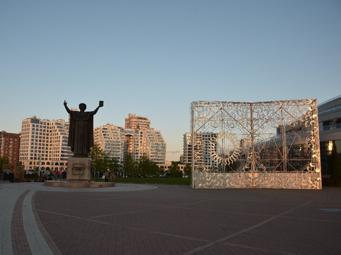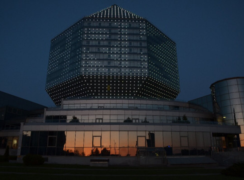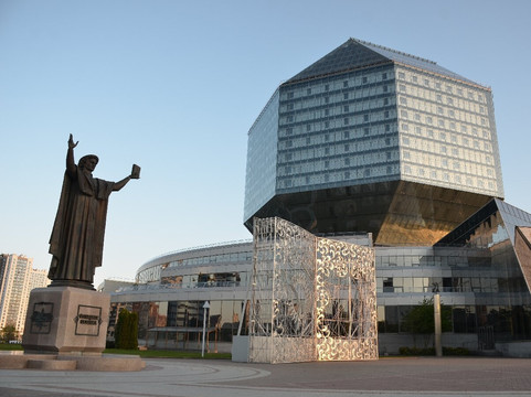 白俄罗斯”(Tsveti,白俄罗斯)在其中一栋高层建筑上。不过,天气好的时候用双筒望远镜也可以看到明斯克市中心。登顶是通过透明玻璃的高速电梯进行的图书馆的入口也设计得很有趣,正门的左右两侧是不同语言的铭文组成,意思是一样的,即:“让建筑物旁边有一座弗朗西斯·斯卡里纳(Francis Skaryna,1490-1551 年)的纪念碑,他是中世纪白俄罗斯人的骄傲、科学家、教育家、医生和印刷先驱。