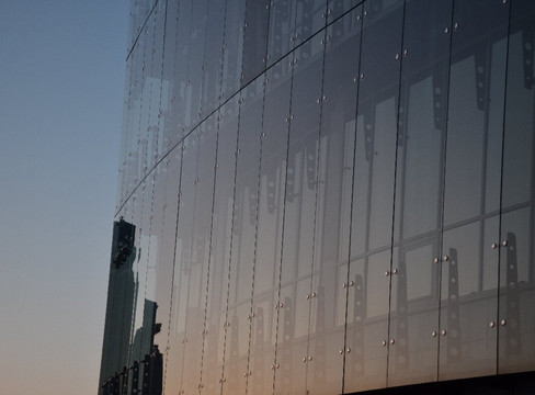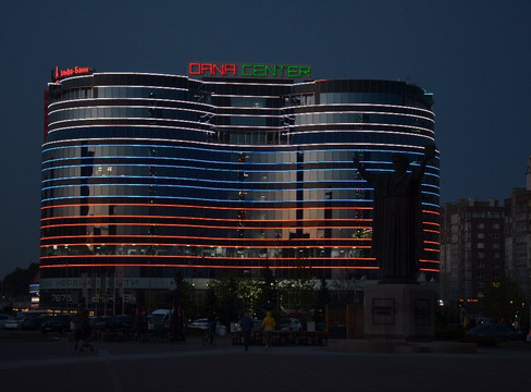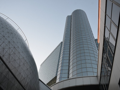 建筑师维诺格拉多夫和克拉马连科。该建筑的几何形状非常复杂,用“菱方八面体”(由 8 个三角形和 18 个正方形组成的三维图形)一词来描述。建筑高度72.6米(23层),重量13.5万吨,其中图书2万吨。建筑物的夜间照明也很不寻常——一个基于 LED 集群的巨型多色屏幕(媒体立面),其图案不断变化。寓言般地,图书馆被称为“知识的钻石”。