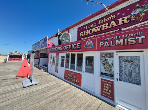 The end of the pier (outside Long John Silver bar) is a bit of a suntrap, & is sheltered from the wind. The bar itself is good, & the staff friendly. The toilets need attention (cleaning is... well I'm not sure it happens). The only other slight moan is that it shuts at about 5 for several hours, & they advise you to go to the Tavern at the pier entrance 🤔 The issue being that the Tavern isn't the suntrap that the one at the end of the pier is. Not sure why this strange practice takes place, as I'm sure it's costing them custom tbh.