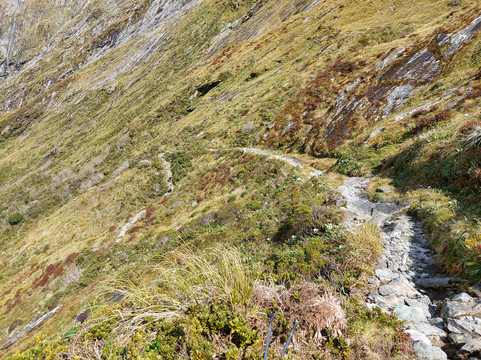 米尔福德步道具有挑战性,但步道的建造和维护方式使其非常可行,即使对于 70 多岁的超重男性来说也是如此。步道表面大多宽阔而光滑。建议穿靴子,因为有岩石和不平坦的部分。麦金农山口的之字形路线使攀登变得相当容易。由于雪崩危险,我们使用了进入亚瑟谷的替代路径。这条路很崎岖,有大片悬崖和倒下的树木,但可以通行,尽管我们在下山结束时筋疲力尽。感谢 DOC 保持了这条步道!