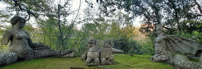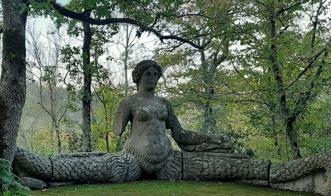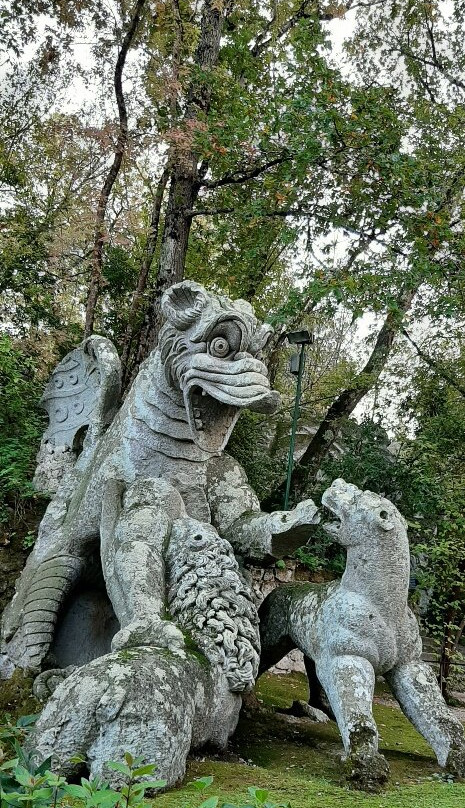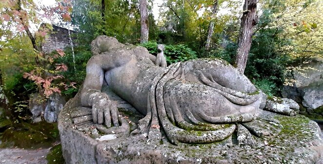 Ho trovato molti riferimenti alla mitologia, ho visto le figure femminili a forma di sfinge con il corpo leonino, il Pan-Giano che sembra guardare il visitatore, il Proteo-Glauco dalle fauci spalancate e con la lingua-gradino che sembra evocato dalla nascita del mondo dal mare, Ercole e Caco statue allegoriche di potenza in lotta (Ercole sconfigge il gigante Caco figlio del Dio Vulcano che emetteva fuoco dalle fauci), mi è piaciuto il bassorilievo delle tre grazie: Eufrosine, Aglaia, Talia. Ho ammirato la Venere egizia posta su conchiglie di ali di drago, mi ha attirato il gruppo scultoreo con il drago dal corpo di rettile e ali di pipistrello che contrasta il leone, il lupo, il cane , metafora di contrasti e difficoltà. Graziosa la Cerere Dea dei raccolti e della fertilità. Molto languida la Ninfa dormiente che posa su un pietrone ovale con un piccolo cane da compagnia a lato. Mi sono deliziata a guardare la Furia alata con ala di drago, busto di donna e coda di sirena e zampe leonine, l'Echidna come bella donna (era la moglie di Tifeo, colei che generò mostri), il Cerbero (cane a tre teste, guardiano del parco, figlio di Echidna). Ho adorato Persefone-Proserpina regina degli inferi ma soprattutto colei che emergendo da sottoterra genera il rifiorire della vita e per me è soprattutto questo….la caducità della vita….la simbologia che ho percepito nel passeggiare nel parco di Bomarzo, dignitosa espressione magnanima del nobile principe Orsini.