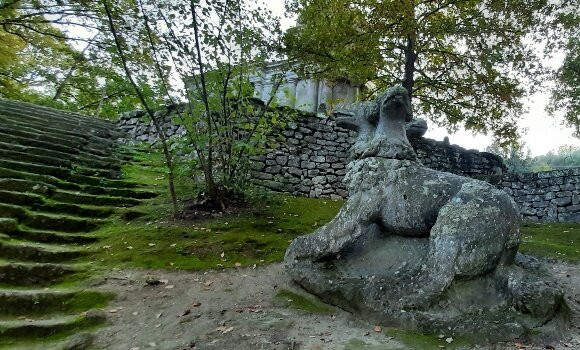 我发现了许多与神话相关的元素:我看到了狮身人面像的女性形象,仿佛在凝视着参观者;还有张着血盆大口、吐着阶梯状舌头的普罗透斯-格劳科斯,仿佛象征着世界从海洋中诞生;以及象征力量对抗的赫拉克勒斯和卡库斯的寓言雕像(赫拉克勒斯击败了火神伏尔甘之子、能从口中喷火的巨人卡库斯);我还很喜欢三位美惠女神——欧佛洛绪涅、阿格莱亚和塔利亚的浅浮雕。我欣赏了置于龙翼贝壳上的埃及维纳斯,也被一组龙的雕塑所吸引,它有着爬行动物般的身躯和蝙蝠般的翅膀,与狮子、狼和狗形成鲜明对比,象征着对比和苦难。丰收和生育女神刻瑞斯姿态优雅。睡梦中的仙女慵懒地倚靠在一块椭圆形石头上,身边依偎着一只小狗。我欣喜地凝视着长着龙翼、女人身躯、美人鱼尾巴和狮爪的复仇女神;还有美丽动人的厄喀德娜(她是堤丰的妻子,也是众怪兽之母);以及三头犬刻耳柏洛斯(公园的守护者,厄喀德娜之子)。我崇拜冥后珀耳塞福涅-普罗塞庇娜,但最令我敬仰的,是她从大地中升起,带来生命的重生。对我而言,这首先体现的是……生命的短暂……这是我在博马尔佐公园漫步时所领悟到的象征意义,也是高贵的奥尔西尼王子庄严而宽宏的表达。