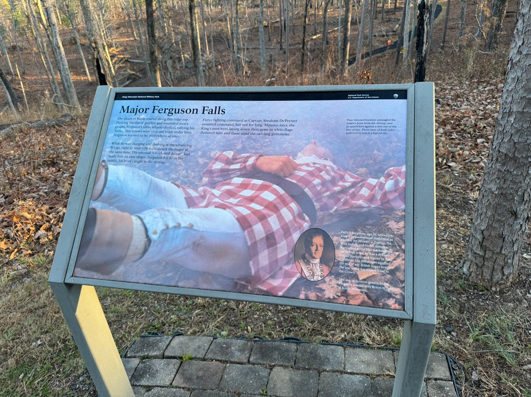 点评:The battlefield has a nice visitor center and a small but comprehensive museum. Bathrooms are on the premises just adjacent the visitors center which are clean with running water. The film gives a clear sense of the tragedy of what was clearly a backcountry civil war between Torres and Patriots or Over the Mountain Men. Brutal battle which shows how British Major Ferguson fatally underestimated his foes and allowed he and his forces to be trapped and defeated. A monument to Ferguson is on hilly trail where he is buried. Another tall obelisk at the top is a testament to those who fell in brutal battle. Sad exploitation of neighbor vs neighbor in the most divided state in the colonies. Important patriot victory. Trails are a bit steep in places and can be a bit challenging to walk but lots of benches to rest. Interpretive historical markers are a great guide.