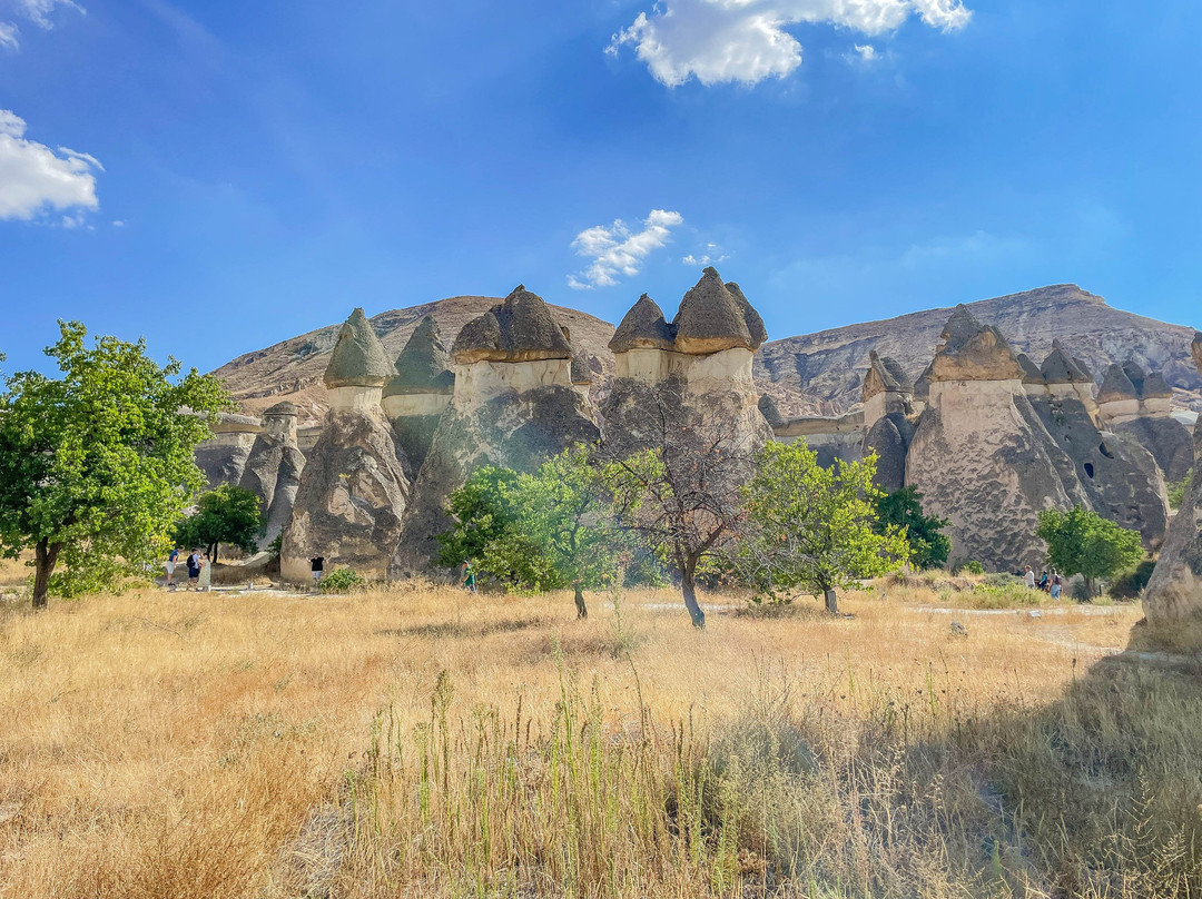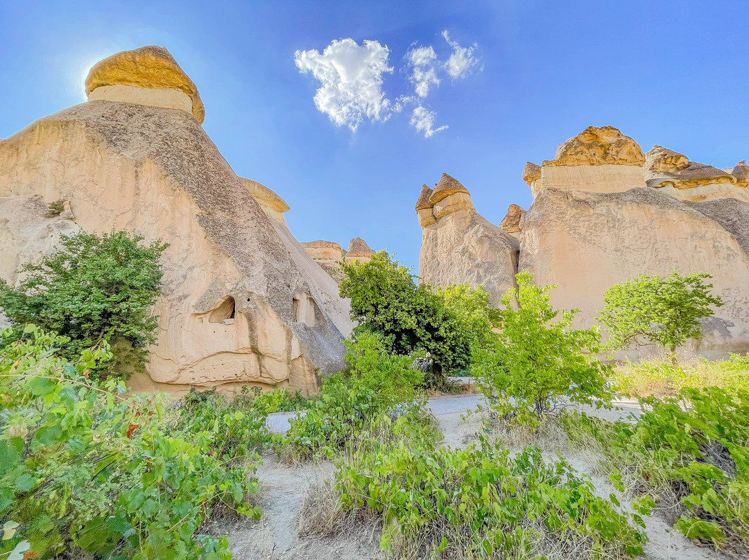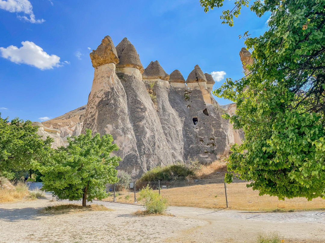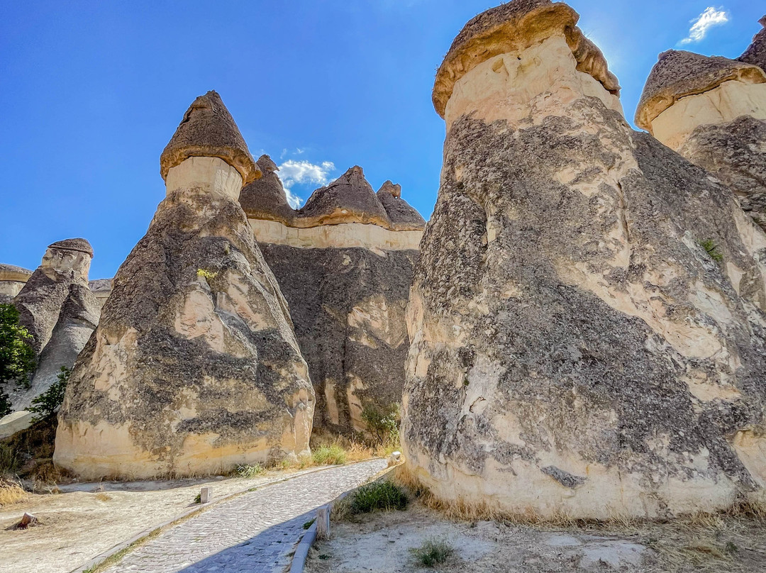 翻译:帕夏巴格山谷,又名僧侣谷,是位于卡帕多西亚库梅村的一处独特景点,距离格雷梅市东北约10公里。山谷以其奇特的岩层而闻名,这些岩层是由火山喷发和数千年的侵蚀作用形成的。帕夏巴格山谷堪称地质奇观,其标志性景观是高耸的仙女烟囱,有些高达40米。这些高耸的锥形岩石宛如一片巨大的岩石蘑菇森林。传说这些奇特的岩石是由仙女们创造的,她们在岩石下建造了地下住所——因此得名“仙女烟囱”。帕夏巴格山谷的仙女烟囱虽然不如其他山谷的仙女烟囱那么高,但形状更像蘑菇。它们的颜色并不像爱情谷那样均匀,因为它们由两种岩石构成。岩石较低、较软的部分呈米色,而较硬的顶部则呈棕色。此外,山谷中还有一些岩石地貌,它们被分割成多个锥形头部,而其他山谷中的仙女烟囱则是独立的岩层。一条铺砌的小路通往山谷,尽头是一处陡峭的悬崖,但许多岔路通往山谷,方便游客漫步于这些岩柱之间。值得注意的是,进入山谷需要支付门票,而且在旅游旺季期间可能会非常拥挤。