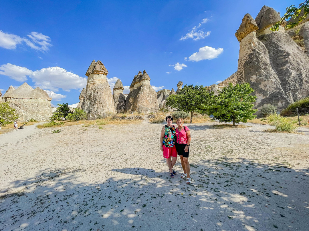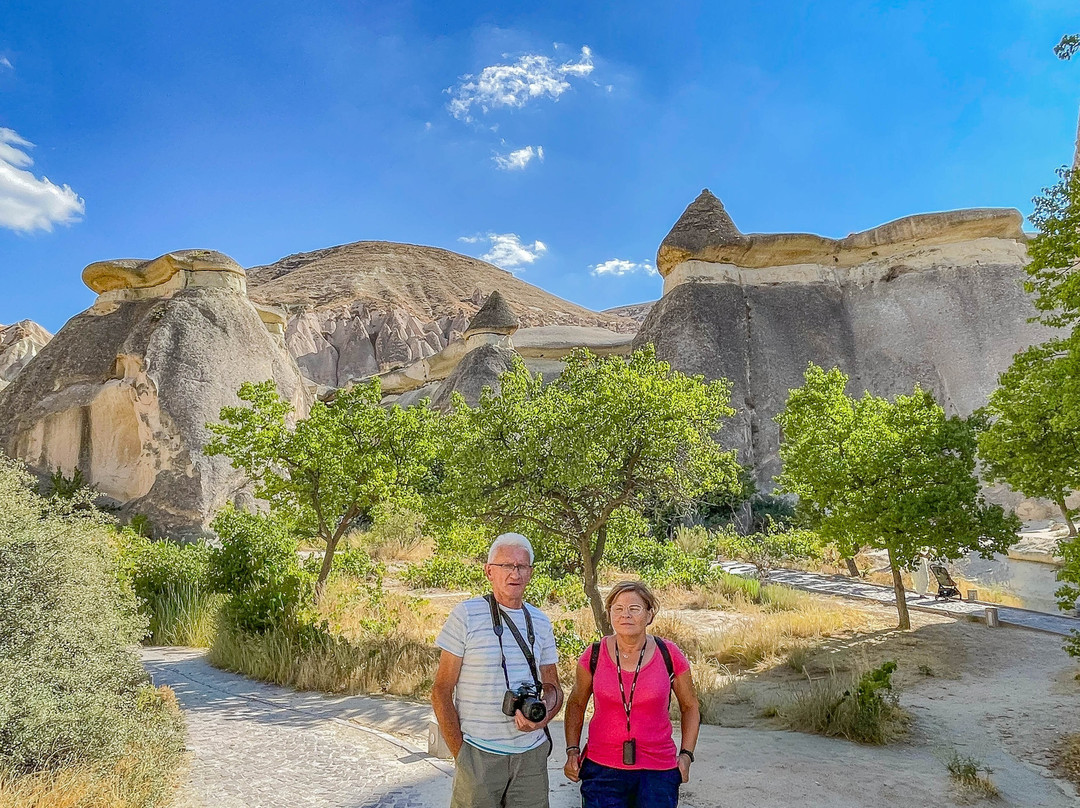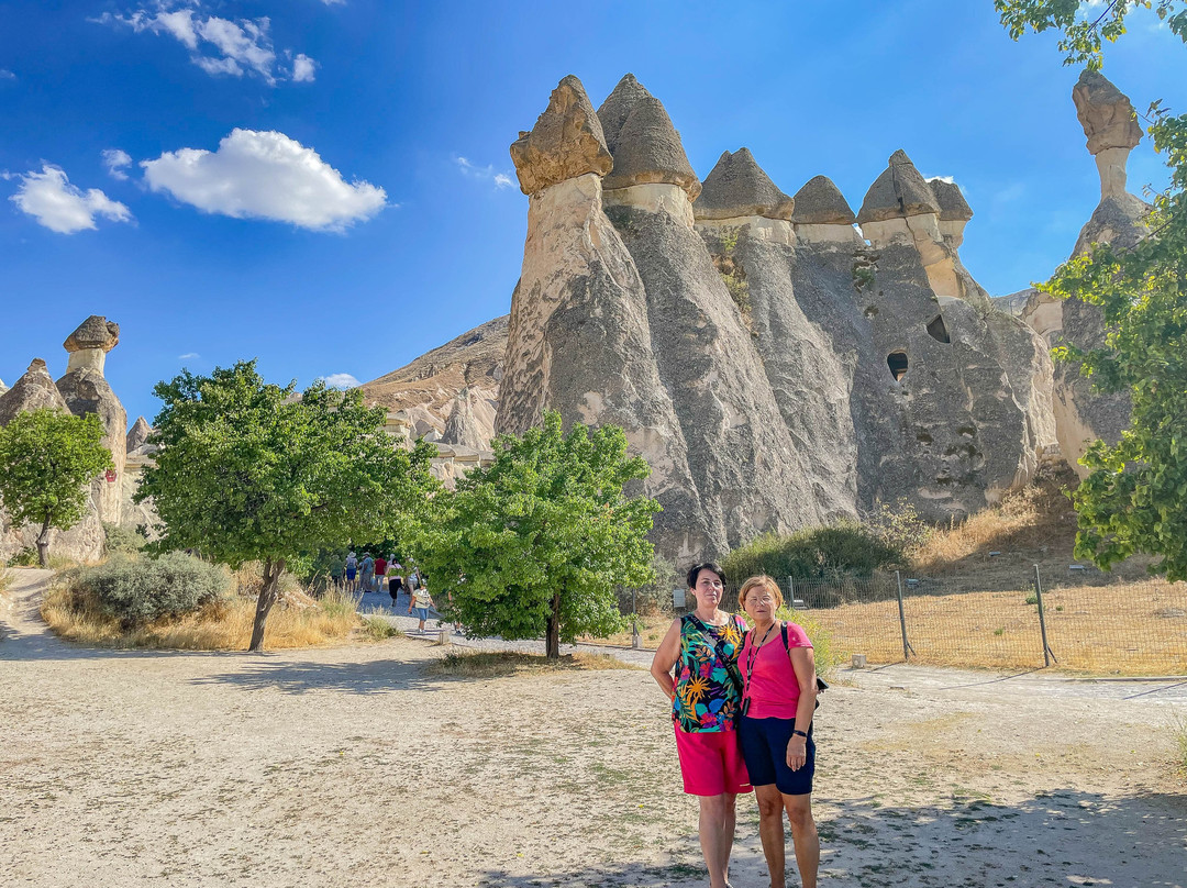 点评:Dolina Pasabag zwana również Doliną Mnichów, to wyjątkowe miejsce znajdujące się w Kapadocji na terenie miejscowości Kume, ok. 10 km na północny-wschód od miasta Goreme. Dolina słynie z niezwykłych formacji skalnych, ukształtowanych przez erupcję wulkanów i erozję na przestrzeni tysięcy lat. Dolina jest geologicznym cudem, charakteryzującym się wysokimi, bajkowymi kominami, z których niektóre osiągają wysokość 40 m. Te wysokie skały w kształcie stożka wyglądają jak las ogromnych skalnych grzybów. Legenda głosi, że te wyjątkowe skały zostały stworzone przez wróżki, które zbudowały swoje podziemne domy pod skałami - stąd nazwa kominy wróżek. Kominy w Dolinie Pasabag nie są tak wysokie jak w innych dolinach, ale kształtem przypominają bardziej grzyby. Nie mają jednolitego koloru jak np. w Dolinie Miłości, bo zbudowane są z dwóch rodzajów skał. Dolne, bardziej miękkie części skał maja barwę beżową, a ich twardsze szczyty są brązowe. Poza tym w dolinie występują również skały dzielące się na kilka stożkowatych głów, podczas gdy w innych dolinach kominy wróżek to samodzielne struktury. Do doliny wchodzi się po brukowanej ścieżce, która, która kończy się przy urwistym klifie, ale w bok odchodzi wiele ścieżek, którymi można wędrować wśród skalnych kominów. Warto wiedzieć, że wstęp do doliny jest płatny i że w sezonie jest ona zatłoczona do granic możliwości.