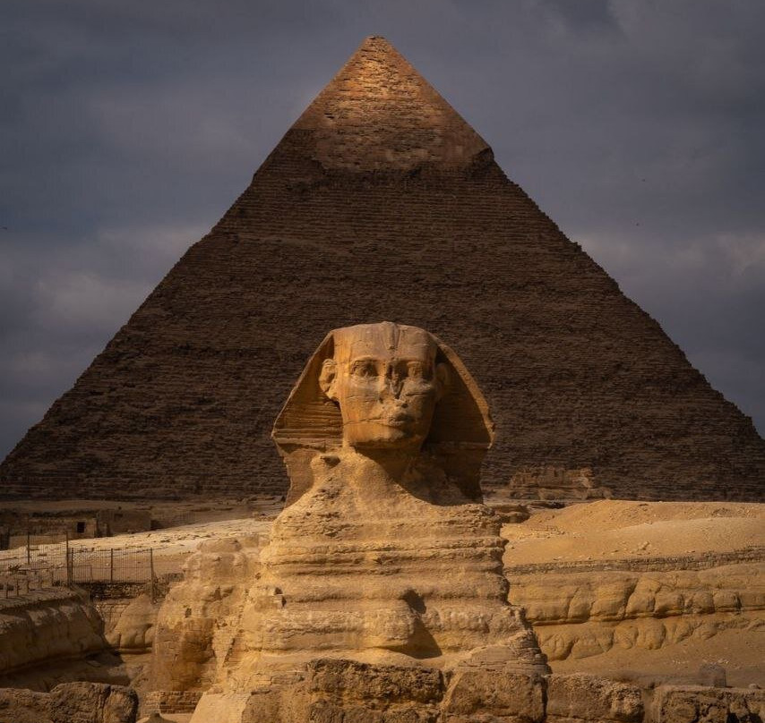 The Sphinx has the body of a lion and the head of a human—presumably the image of Pharaoh Khafre.