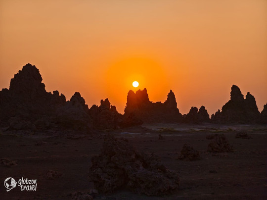 点评:To niesamowite jezioro położone w zapadlisku skalnym Afar na granicy Etiopii i Dżibuti .Oddalone jest o ok. 135 km na poł.-zachód od stolicy kraju .To typowe jezioro endoreiczne tworzące zamkniętą zlewnie .Wzrasta więc zasolenie jego wód a poza tym stale stopniowo wysycha przez prowadzone prace melioracyjne w jego okolicy . Słone jezioro otaczają przeróżne skalne formacje a na jego brzegach możemy obserwować stromatolity . Ten księżycowy krajobraz urozmaicają flamingi ,pelikany i inne wodne ptaki .Niektóre ze skalnych kominów dochodzą do 50 m wysokości .Obserwować tu można także zjawiska geotermalne w formie wyziewów czy gorących oparów. Zjawiliśmy się tu specjalnie wczesnym rankiem na wschód słońca . Było mnóstwo pozytywnych wrażeń . Niewątpliwa atrakcja ale trochę gorzej jest z bazą turystyczną w okolicy .My spaliśmy w pobliżu , w obozie ze "specjalnymi" namiotami i kilkoma murowanymi domkami .Można był nawet spać pod gołym niebem , choć był uciążliwy wiatr ale było ciepło .