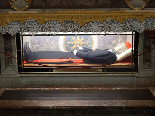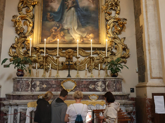 翻译:现存的教堂由吉安·巴蒂斯塔·瓦卡里尼在1693年地震后设计,其引人注目的白色大理石立面融合了以往时代的元素。教堂内部,除了保存在珍贵银质半身像中的守护圣人遗骸外,还安葬着众多名人,其中包括卡塔尼亚著名作曲家文森佐·贝利尼。