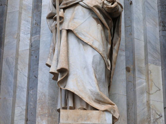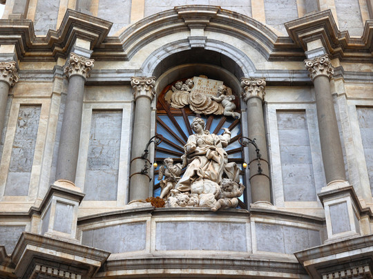 Le colonne di granito grigio che decorano i tre ordini della facciata: non sono state scolpite appositamente per la chiesa, ma provengono dall'antico Teatro Romano di Catania. Gli architetti del passato hanno spesso recuperato materiali dagli edifici di epoca classica per ricostruire la città dopo le catastrofi, rendendo il Duomo un vero e proprio mosaico della storia millenaria della città.