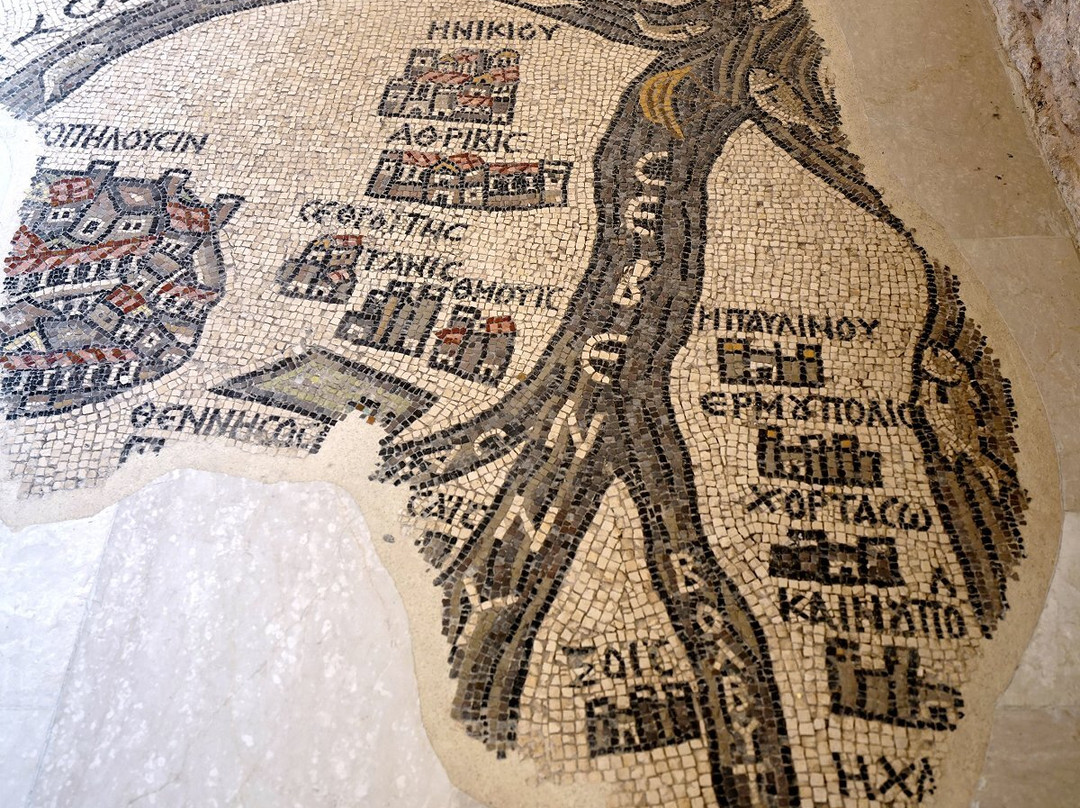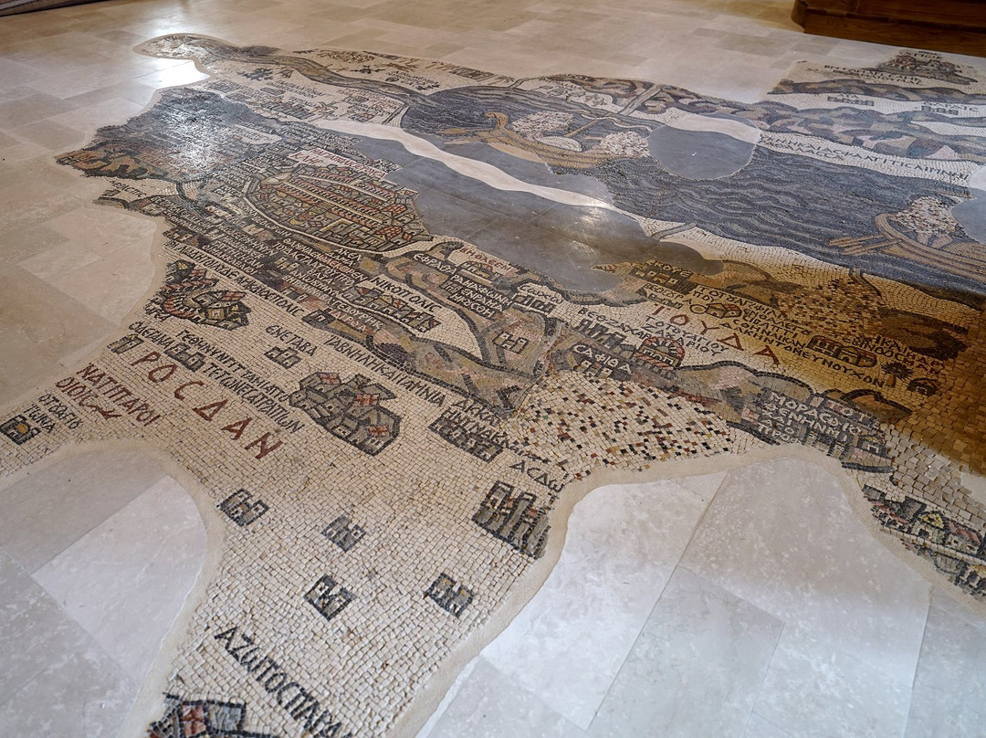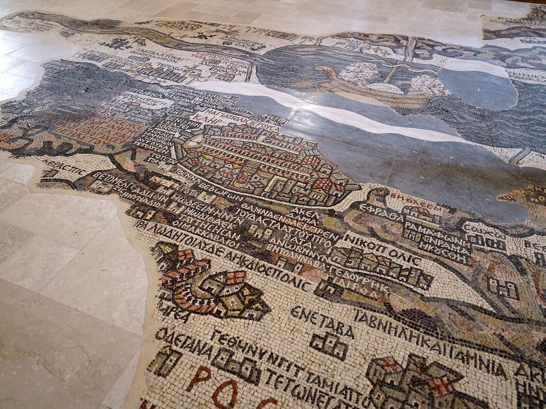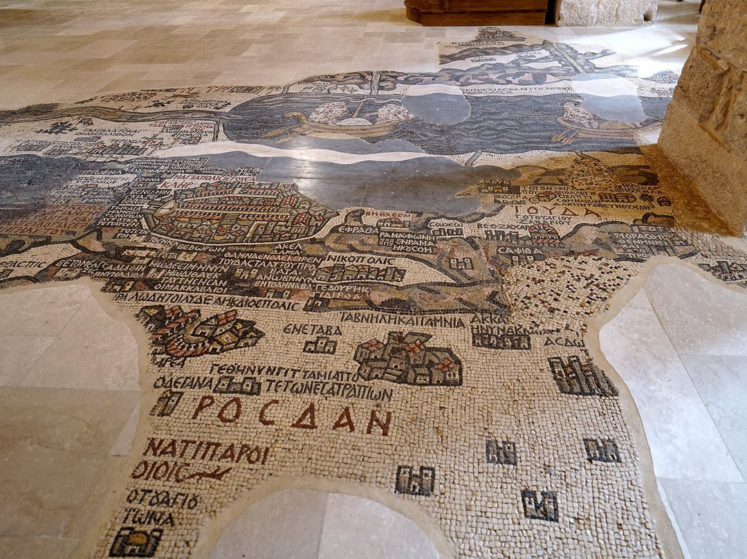 翻译:离开安曼前往佩特拉的途中,我们在马达巴稍作停留,参观了圣乔治教堂内著名的巴勒斯坦马赛克地图。这座教堂建筑风格现代,内部装饰色彩和图像都带有典型的东正教传统,若非教堂内保存着一幅可追溯至公元550年左右的马赛克遗迹,它或许并无特别之处。这幅马赛克曾是另一座建筑的地面,它以丰富的想象力,不拘泥于距离和比例,描绘了从圣地一直延伸到尼罗河口的整个区域。具体来说,它描绘了城墙环绕的耶路撒冷和死海,以及两艘船,船上乘客的面容在拜占庭圣像破坏者的蹂躏下被抹去。这一切都非常有趣且引人深思,而且参观起来也不需要花费太多时间。之后,您可以轻松继续行程,因为在马达巴,除了常见的众多摊位之外,我并没有看到其他值得一看的地方。