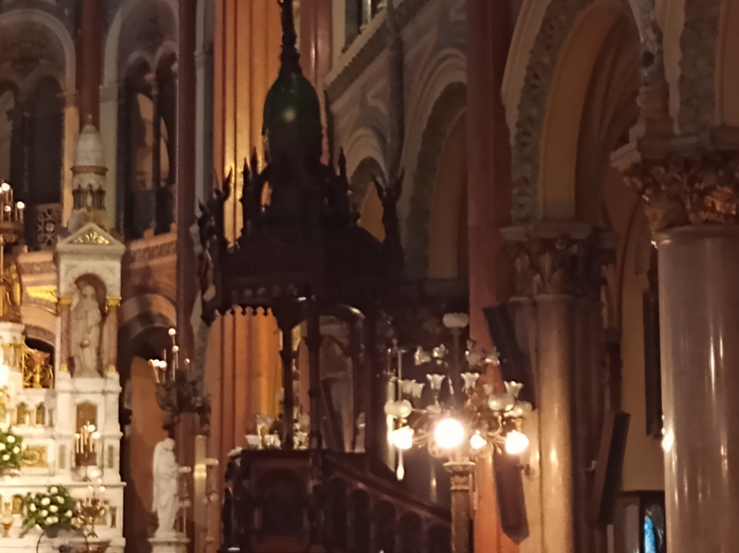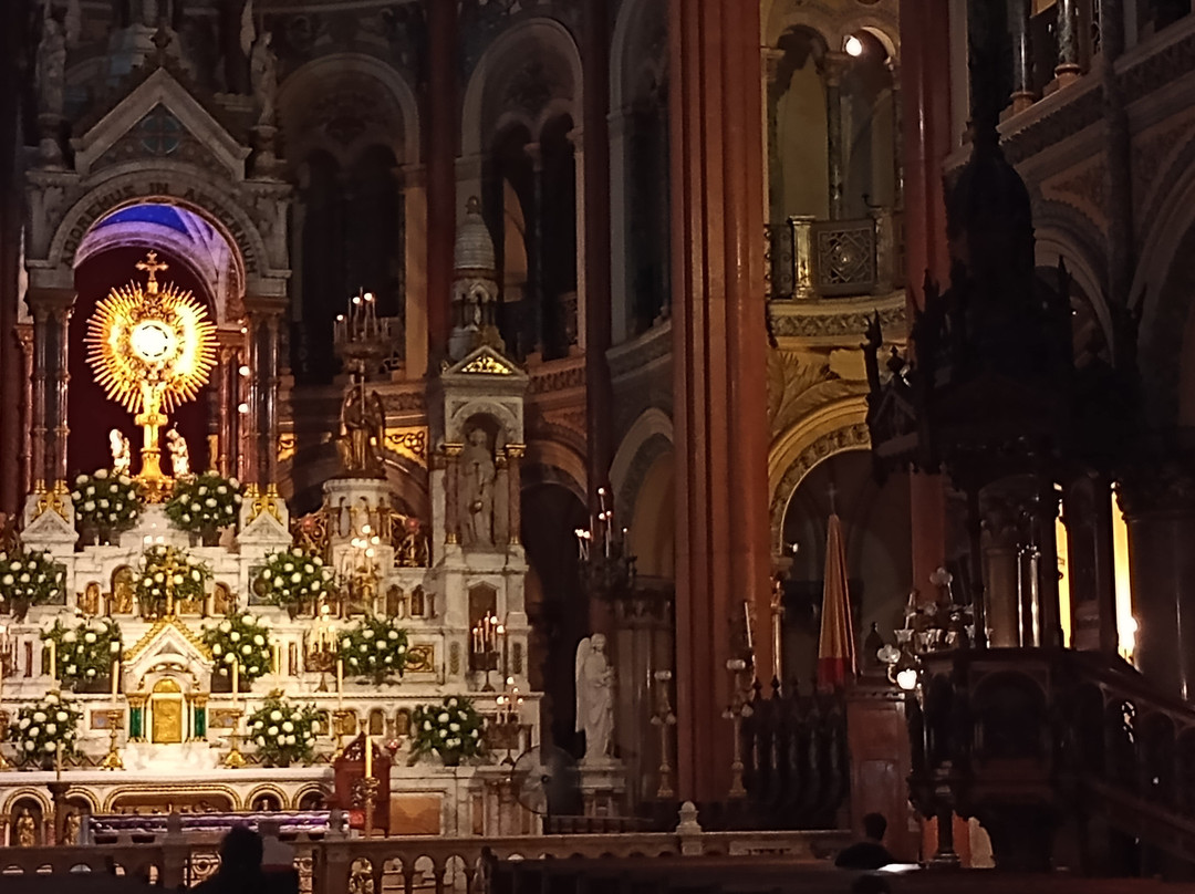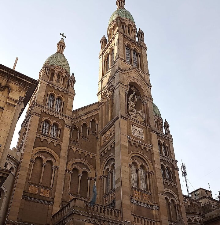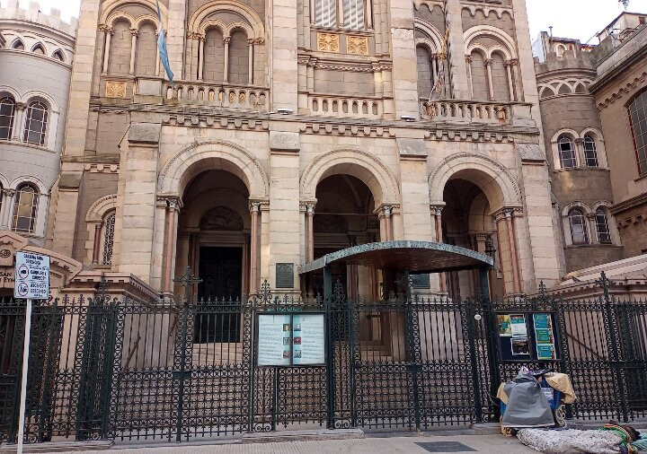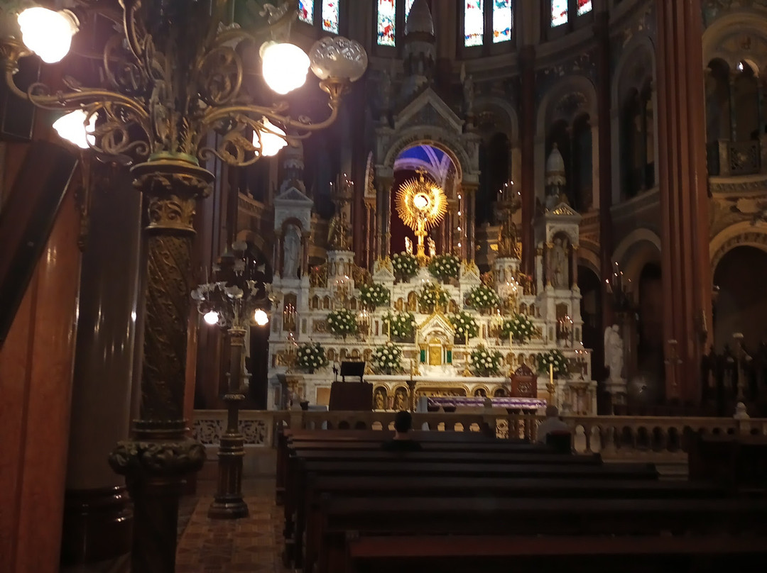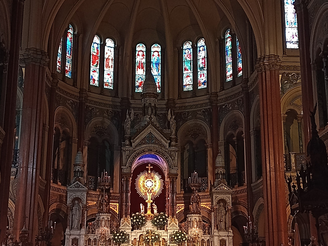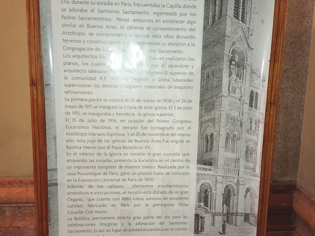 翻译:我最近参观了圣体圣事教堂,这是一座位于布宜诺斯艾利斯丽池区圣马丁街(San Martín Street)的天主教教区教堂,介于米格尔·图林·德·阿尔维亚尔街(Miguel Turin de Alvear Street)和里卡多·罗哈斯博士街(Dr. Ricardo Rojas Street)之间,卡瓦纳大厦(Kavanagh Building)对面。教堂由梅赛德斯·卡斯特利亚诺斯·德·安乔雷纳(Mercedes Castellanos de Anchorena)委托建造,她居住在距离教堂约150米的安乔雷纳宫(Anchorena Palace),并将宫殿捐赠给了圣体圣事会神父会。这座教堂由法国建筑师库隆和肖维(Coulomb and Chauvet)设计,采用折衷主义风格,融合了罗马式、哥特式和拜占庭式元素。教堂于1916年由埃斯皮诺萨总主教祝圣,同年教宗本笃十五世将其提升为宗座圣殿。教堂正面有五座松果状的塔楼,三座位于正面,两座位于后殿。中央塔楼壁龛内矗立着一组雕塑,描绘的是圣体高举的场景。教堂内部由三条中殿组成,中央中殿通往主祭坛,那里安放着以金银打造的圣体光。整座教堂装饰华丽,拥有精美的彩色玻璃窗以及大理石、蓝色花岗岩、青铜和威尼斯马赛克镶嵌画等装饰。告解室、讲坛和木门均出自佛兰德斯雕刻家之手,唱诗班席位也同样如此,其中还配备了一架气势恢宏的五千根音管管风琴。教堂的捐赠者遗骸安葬于地下墓室。这座圣殿不仅是精神圣地,更是一座值得参观的宏伟建筑和艺术瑰宝。