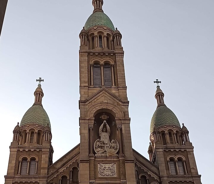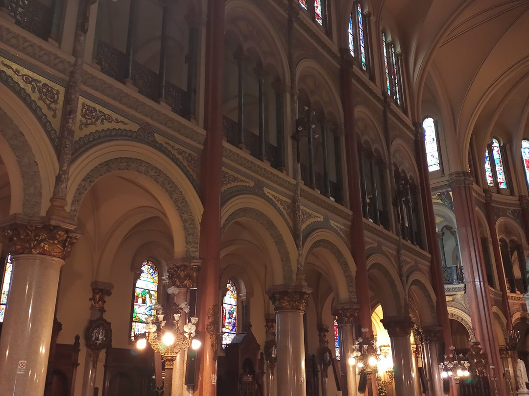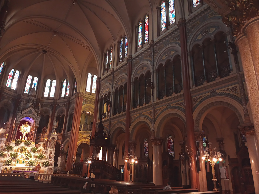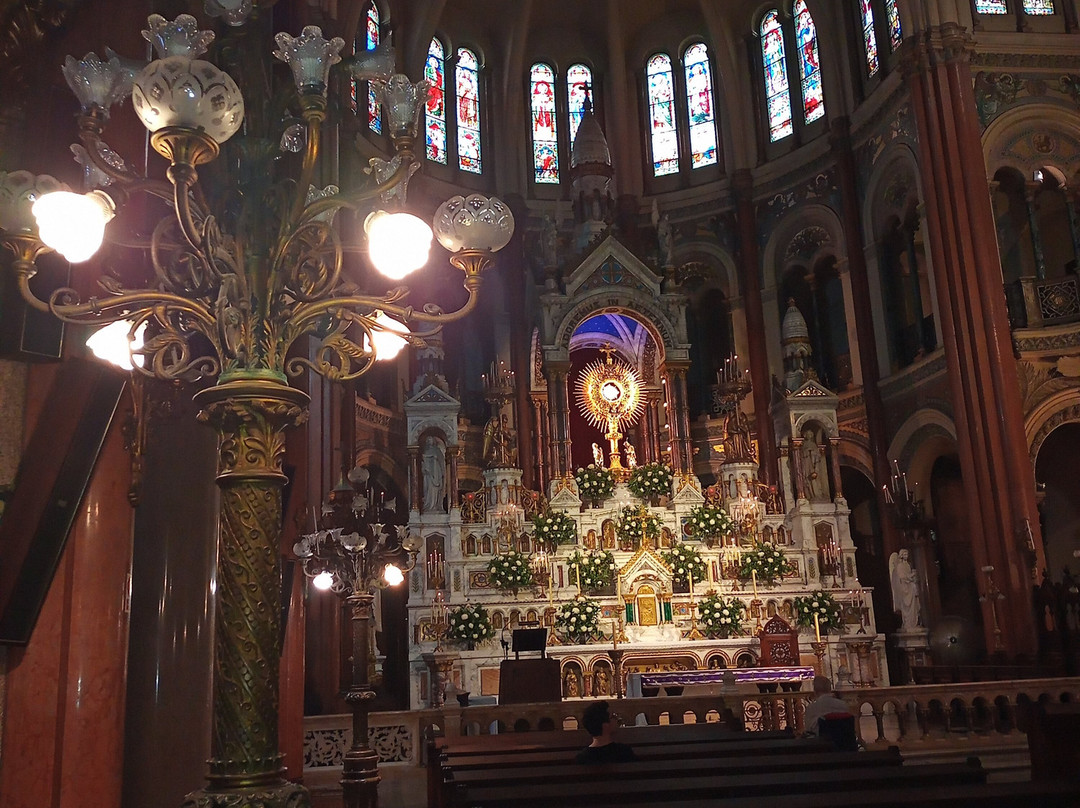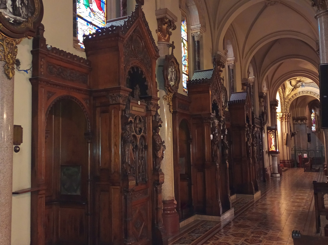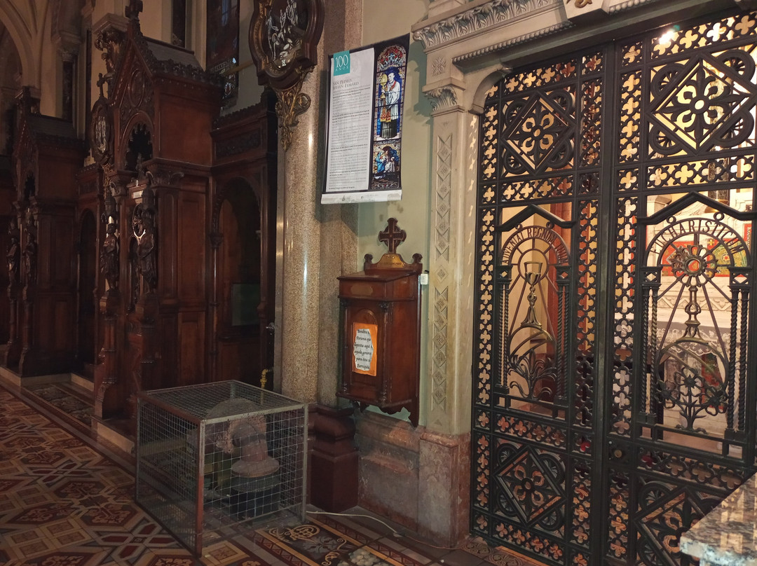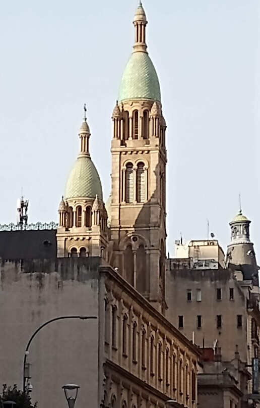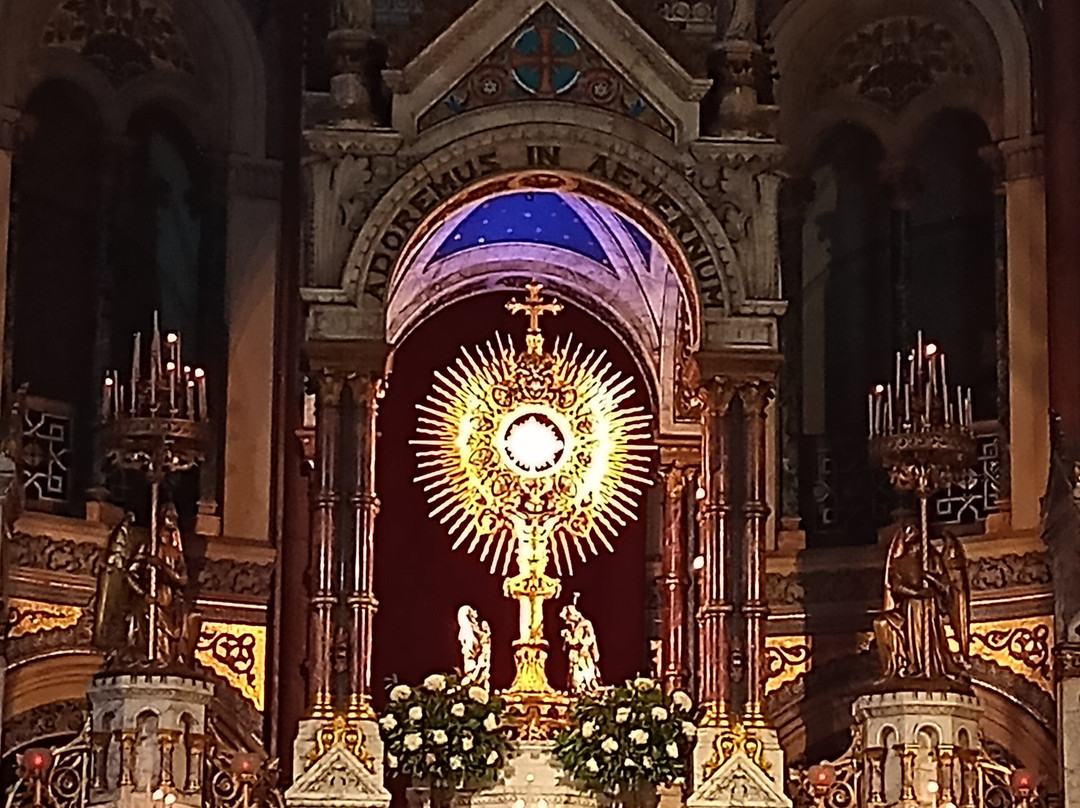 翻译:我最近参观了圣体圣事教堂,这是一座位于布宜诺斯艾利斯丽池区圣马丁街(San Martín Street)的天主教教区教堂,介于米格尔·图林·德·阿尔维亚尔街(Miguel Turin de Alvear Street)和里卡多·罗哈斯博士街(Dr. Ricardo Rojas Street)之间,卡瓦纳大厦(Kavanagh Building)对面。教堂由梅赛德斯·卡斯特利亚诺斯·德·安乔雷纳(Mercedes Castellanos de Anchorena)委托建造,她居住在距离教堂约150米的安乔雷纳宫(Anchorena Palace),并将宫殿捐赠给了圣体圣事会神父会。这座教堂由法国建筑师库隆和肖维(Coulomb and Chauvet)设计,采用折衷主义风格,融合了罗马式、哥特式和拜占庭式元素。教堂于1916年由埃斯皮诺萨总主教祝圣,同年教宗本笃十五世将其提升为宗座圣殿。教堂正面有五座松果状的塔楼,三座位于正面,两座位于后殿。中央塔楼壁龛内矗立着一组雕塑,描绘的是圣体高举的场景。教堂内部由三条中殿组成,中央中殿通往主祭坛,那里安放着以金银打造的圣体光。整座教堂装饰华丽,拥有精美的彩色玻璃窗以及大理石、蓝色花岗岩、青铜和威尼斯马赛克镶嵌画等装饰。告解室、讲坛和木门均出自佛兰德斯雕刻家之手,唱诗班席位也同样如此,其中还配备了一架气势恢宏的五千根音管管风琴。教堂的捐赠者遗骸安葬于地下墓室。这座圣殿不仅是精神圣地,更是一座值得参观的宏伟建筑和艺术瑰宝。
