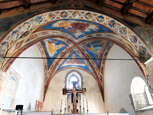 点评:Alla sommità e quasi al centro dell’isola (il suo grande campanile a vela ben si nota anche dal battello; una delle due campane è del XIII secolo) si trova isolata questa antica chiesa romanica del XII secolo, affiancata sulla sx dal cimitero. In conci di pietra a vista ha un esterno molto semplice e sulla facciata, che termina con il citato campanile a vela, si apre solo il portone di accesso che non ha nemmeno una cornice (si entra comunque in chiesa da un'entrata laterale, sul fianco dx). La parte notevole è tutta all’interno per i numerosi affreschi di varie epoche (dal XIII all’inizio del XVI secolo) che coprono le pareti: alcuni rivelano un’ottima fattura e in altri si riconoscono gli stili dei seguaci di Cimabue e di Giotto. Nel presbiterio vi è anche un pregevole crocifisso dipinto del XV secolo, attribuito al perugino Bartolomeo Caporali.