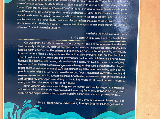 翻译:我和妻子目前正在考拉克度假,今天早些时候我们参观了位于班南克海姆的海啸纪念公园 - 2004 年海啸中受灾最严重的泰国渔业社区之一。