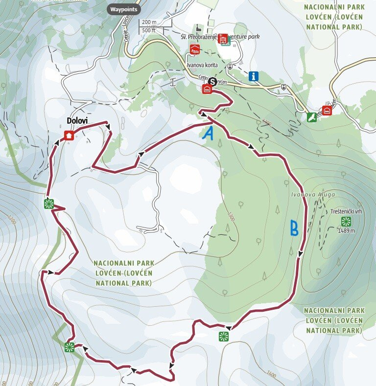 翻译:狼径的起点位于伊万诺娃·科里塔酒店左侧(见附图)。酒店附近有一个小型停车场。步道最初一段是铺好的路,一直到地图上的A点(见附图)。在A点,我们顺时针(向左)走,到达B点(碎石路)。在B点(见附图),您可以选择向右走(主路),或者向左走岔路,爬上一个非常漂亮的观景点(这段路并不难,但比主路更具挑战性,主路基本平坦)。从观景点下山,再次到达B点。从这里开始是一条环形步道,蜿蜒穿过森林,沿途可以欣赏到科托尔湾的美景。继续前行,穿过多洛维村,您将回到A点,然后从那里返回步道的起点。