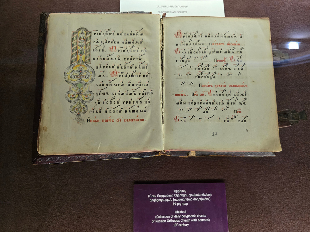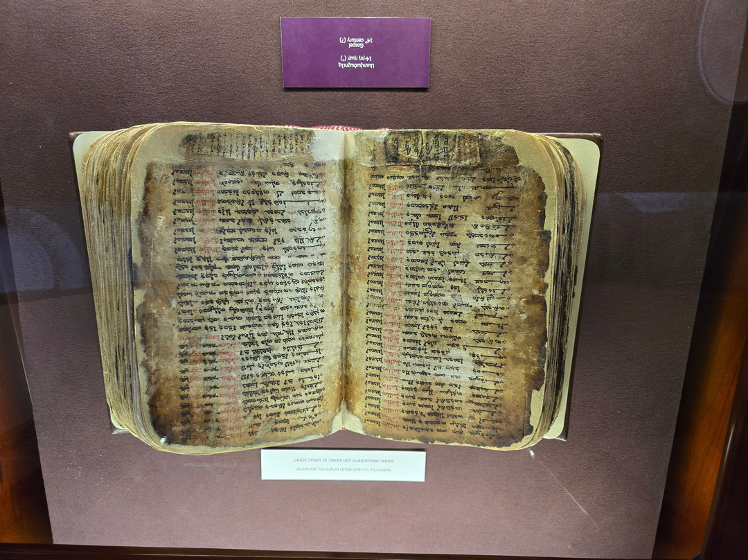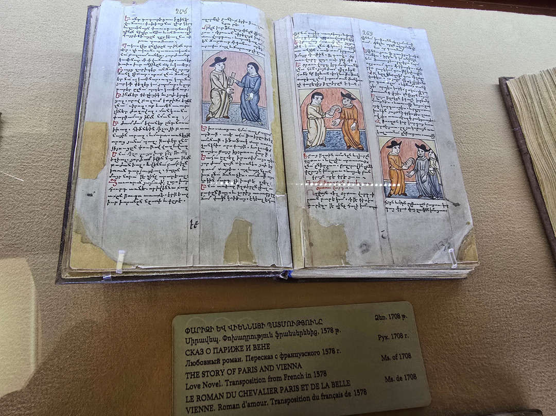 翻译:这是亚美尼亚历史最悠久的博物馆之一,拥有世界一流的藏品,包括超过23000份手稿和50多万份文献。这些手稿绝大多数是亚美尼亚语,但也包含许多不同历史语言(阿拉伯语、波斯语、土耳其语、希腊语、拉丁语、俄语、西里尔语、斯拉夫语等)的手稿,涵盖各个科学领域,其中宗教手稿占了很大比例。