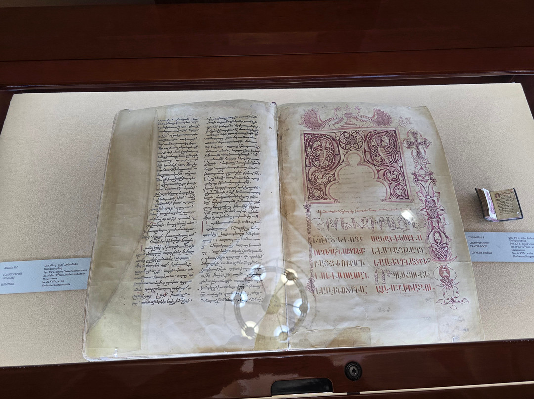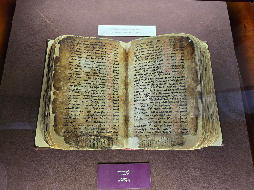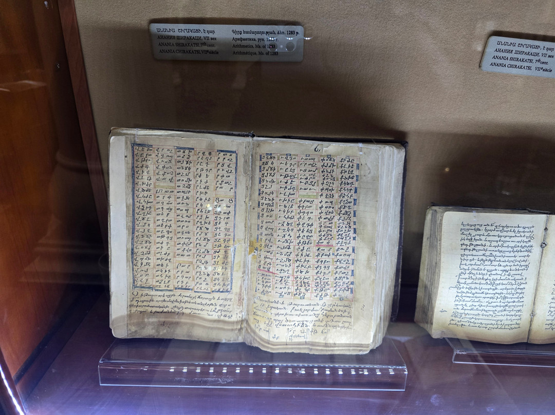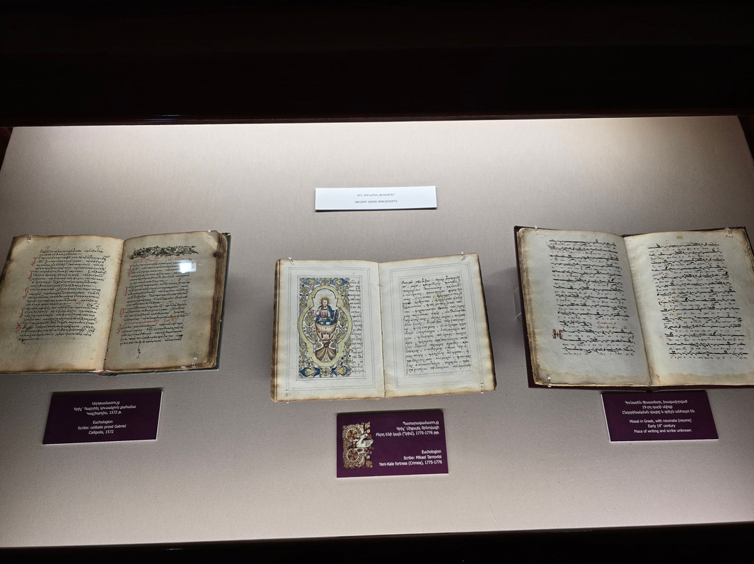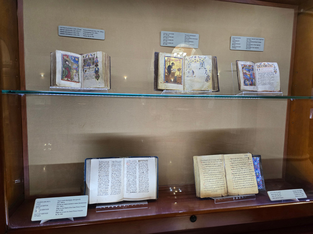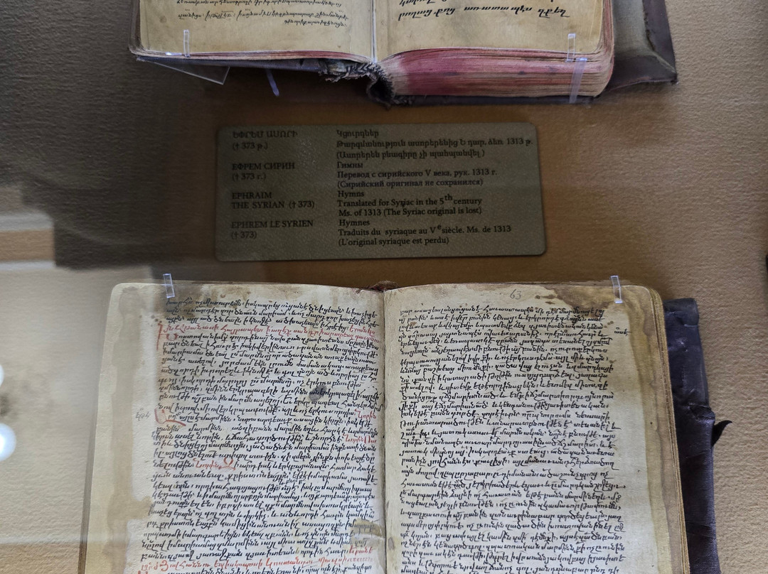 点评:That is one of the best established museums in Armenia. It houses one of the greatest collections worldwide with more than 23000 manuscripts and over half of a million documents. The majority of these manuscripts are obviously Armenian, while there are also many manuscripts in many historical languages (arabic, Persian, Turkish, Greek, Latin, Russian, Cyrillic, Slavic,...etc, and in all aspects of sciences, though a great percentage are religious manuscripts.