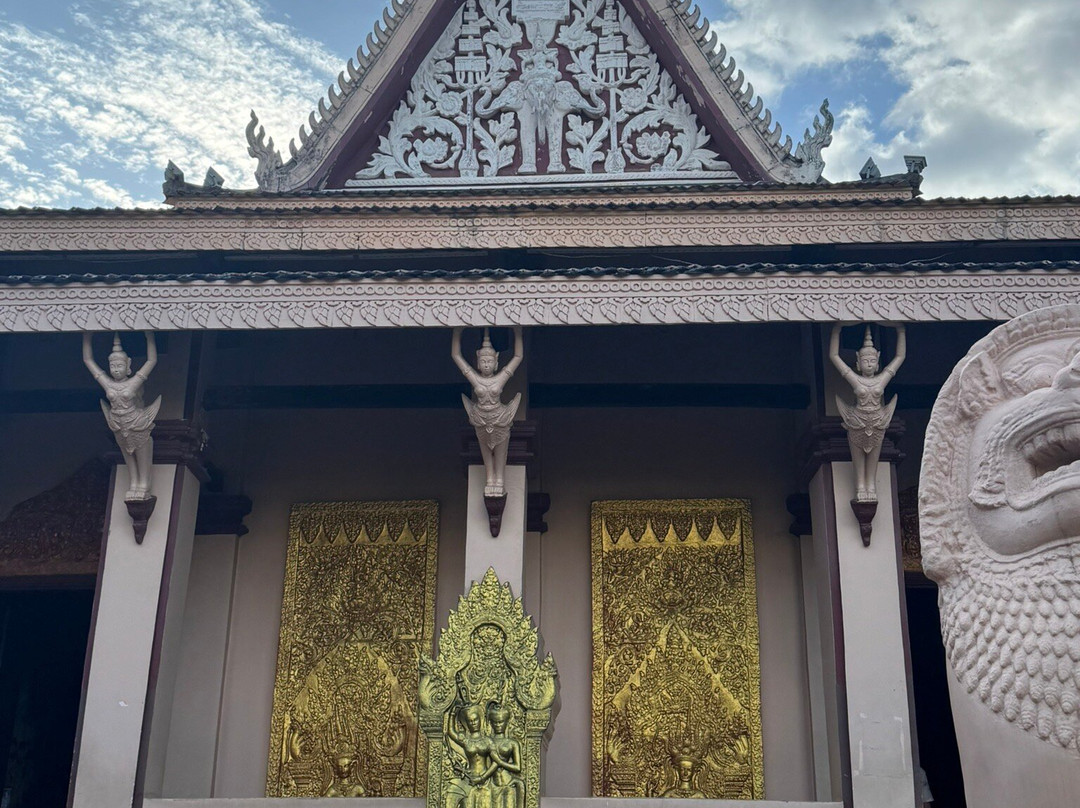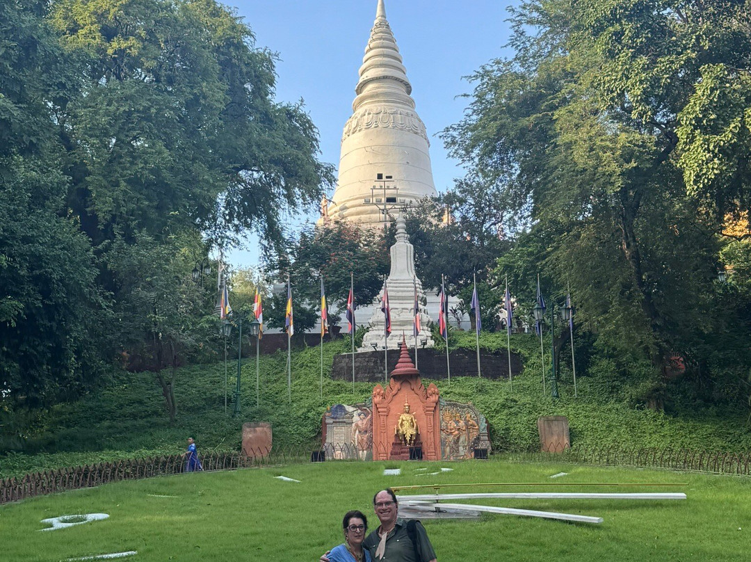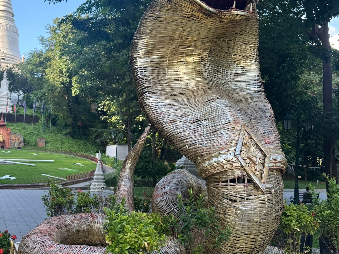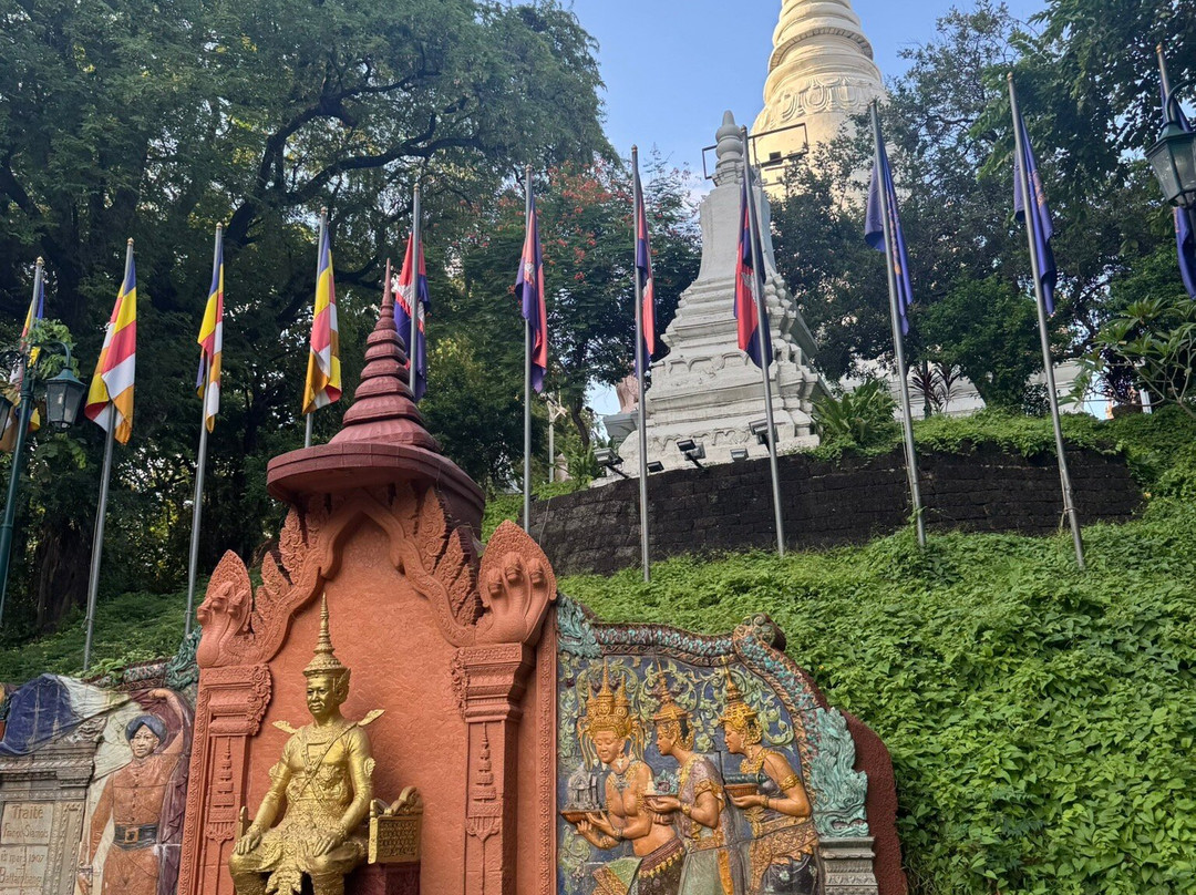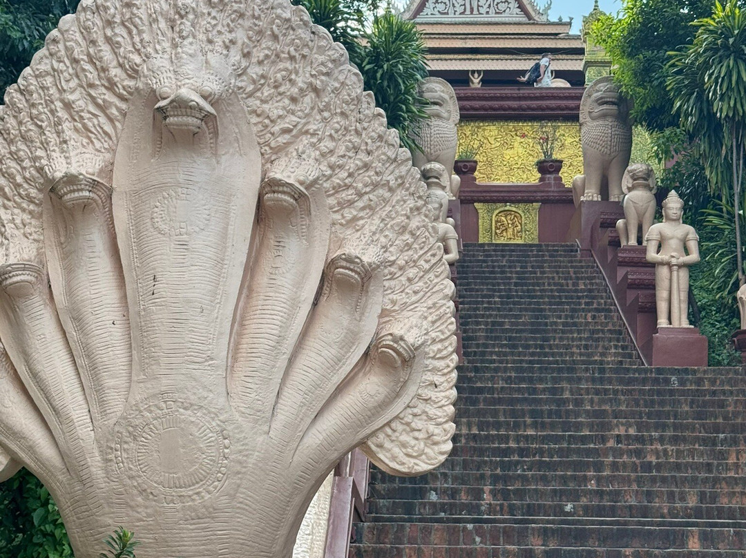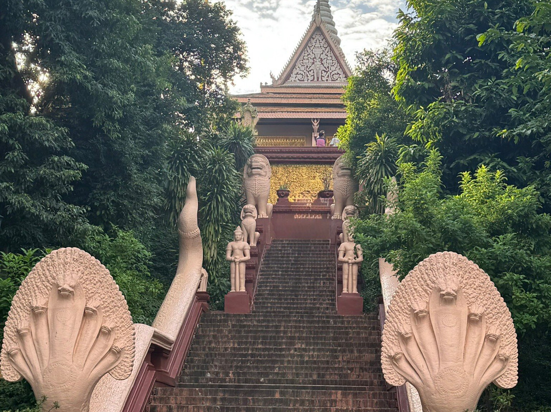 The hill is only 27m high, with the main entrance via a staircase on the eastern side, which is guarded by lions and naga. The main temple building houses the four statues, with a pavilion on the south housing a statue of Lady Penh, and an eclectic shrine dedicated to the genie Preah Chau to the north. West of the temple is the 42m stupa, which contains the ashes of the king. The large garden surrounding the hill, with a giant clock, though it runs a few seconds ahead of Cambodia's official time.
