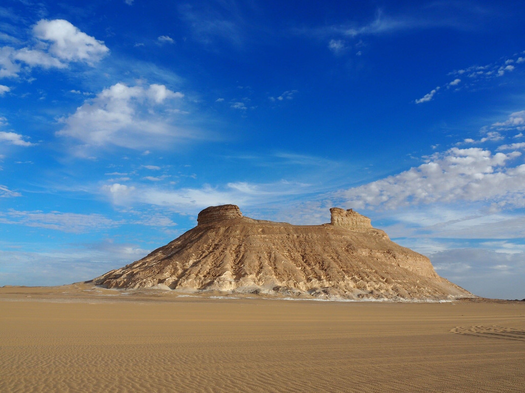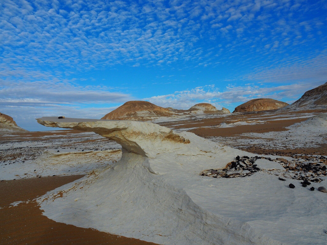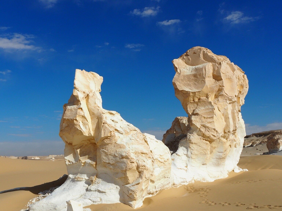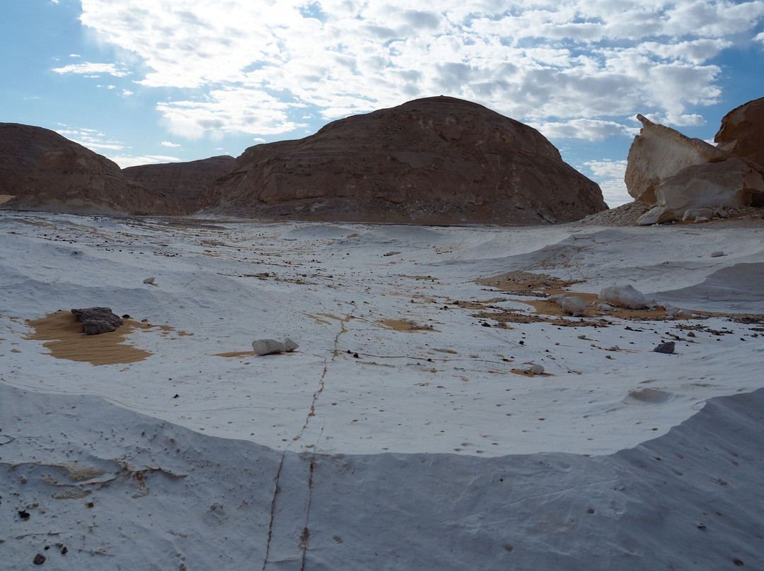 点评:Il deserto bianco merita sicuramente una visita approfondita che preveda almeno una notte di permanenza per poter ammirare il cielo stellato e godere del silenzio e dell’immensità del deserto. Le concrezioni calcaree del white desert danno un aspetto molto suggestivo a panorami che cambiano continuamente man mano che ci si sposta nel deserto. C’è una zona desertica che presenta monumentali concrezioni calcaree di colore bianco con forme che possono ricordare pinnacoli, profili di animali o funghi in altre zone invece il deserto ha dune sabbiose intervallate a collinette rivestite di materiale calcareo che fa ricordare un paesaggio innevato. Consiglio di rivolgersi ad operatori turistici collaudati e referenziati onde evitare spiacevoli sorprese soprattutto per quanto riguarda il mezzo di trasporto e il comfort del campo che viene realizzato per la notte. Bisogna avere un certo spirito di adattamento alla situazione che ovviamente essendo in un deserto è piuttosto spartana. Sarà la guida che vi accompagna a darvi l’attrezzatura e i consigli per farvi trascorrere una notte piacevole nel deserto. Per una questione di igiene è consigliabile portarsi un sacco lenzuolo più leggero del sacco a pelo che di solito viene fornito dall’operatore turistico e che può essere utilizzato come coperta al di sopra del sacco lenzuolo. Consigliate anche salviette umidificate e disinfettanti. Durante la notte la temperatura può scendere molto e quindi è importante munirsi di indumenti caldi. Molto utile anche una lampada portatile per la notte. Di solito viene allestito un fuoco e serviti pasti caldi cucinati sul posto.