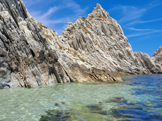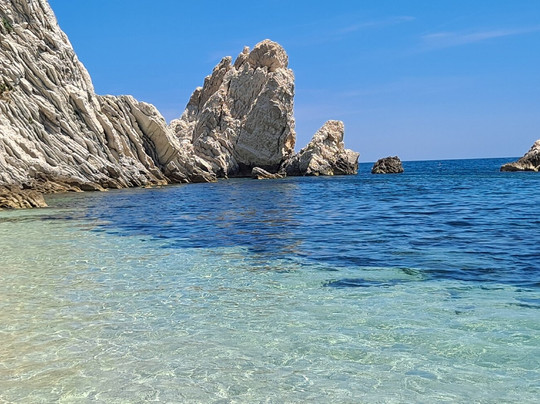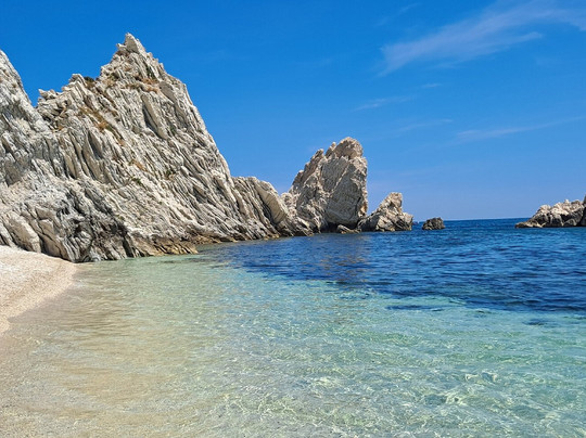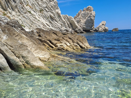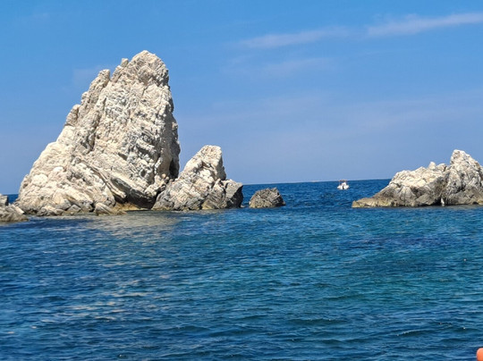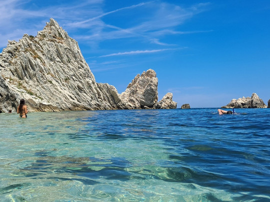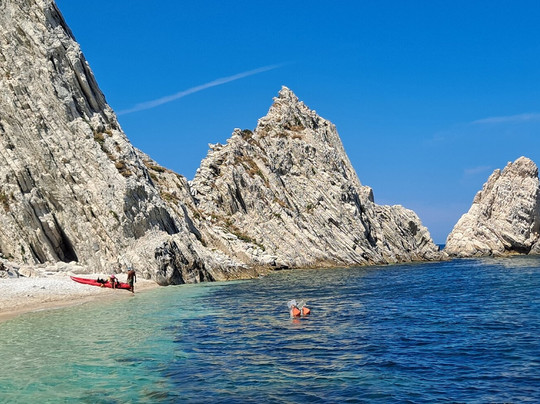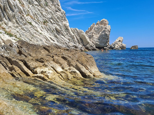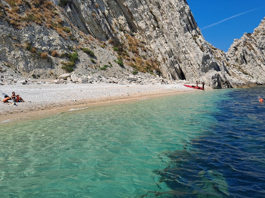 点评:La spiaggia delle due sorelle è, a nostro avviso, la più bella del Conero. Può essere raggiunta solamente via mare con partenza dal porto di Numara con i traghettatori del Conero. Noi ci siamo stati due volte, la prima per circa un' ora in sosta durante la navigazione che da Numana conduce fino a Portonovo, la seconda per tre ore, come transfert sulla spiaggia . Il contesto è estremamente scenografico, spiaggia di ciottoli bianchi, mare limpido e trasparente incorniciato da ripide scogliere e dalle due sorelle, bianchi faraglioni che , per la loro particolare forma, ricordano due suore. A tutti i partecipanti all' escursione viene raccomandato di non asportare nulla dalla spiaggia per mantenere integro il luogo e conservarne la biodiversità. È questo il motivo per cui solo un numero limitato di visitatori può accedere all' arenile e l' accesso è vietato ai natanti e ad altre imbarcazioni. La scelta consente inoltre di godere della bellezza del luogo in totale tranquillità. Abbiamo avuto anche fortuna... la mucillagine è comparsa solo al momento della nostra partenza. E poi per chi ama fare snorkelling , ci sono tante varietà di pesci che ti aspettano ...non resta che preparare maschera e boccaglio !!! Veramente molto suggestivo.